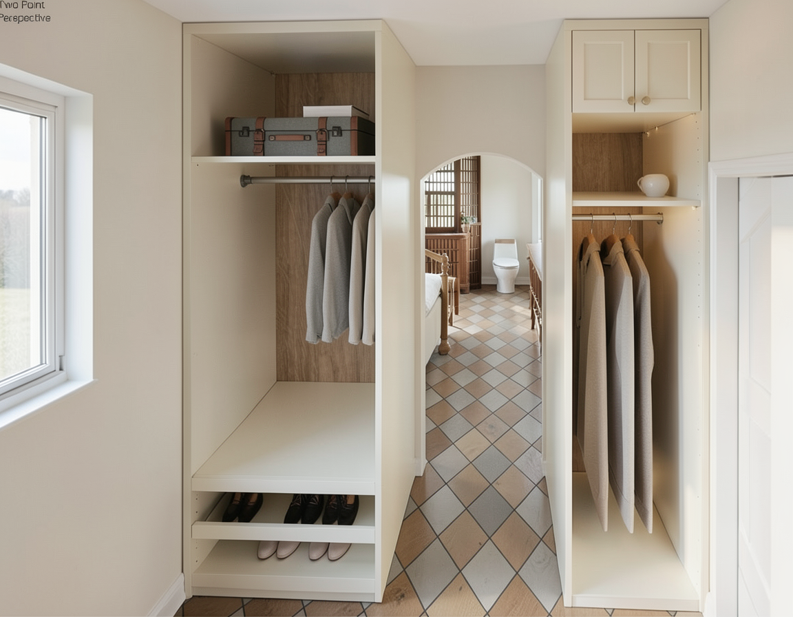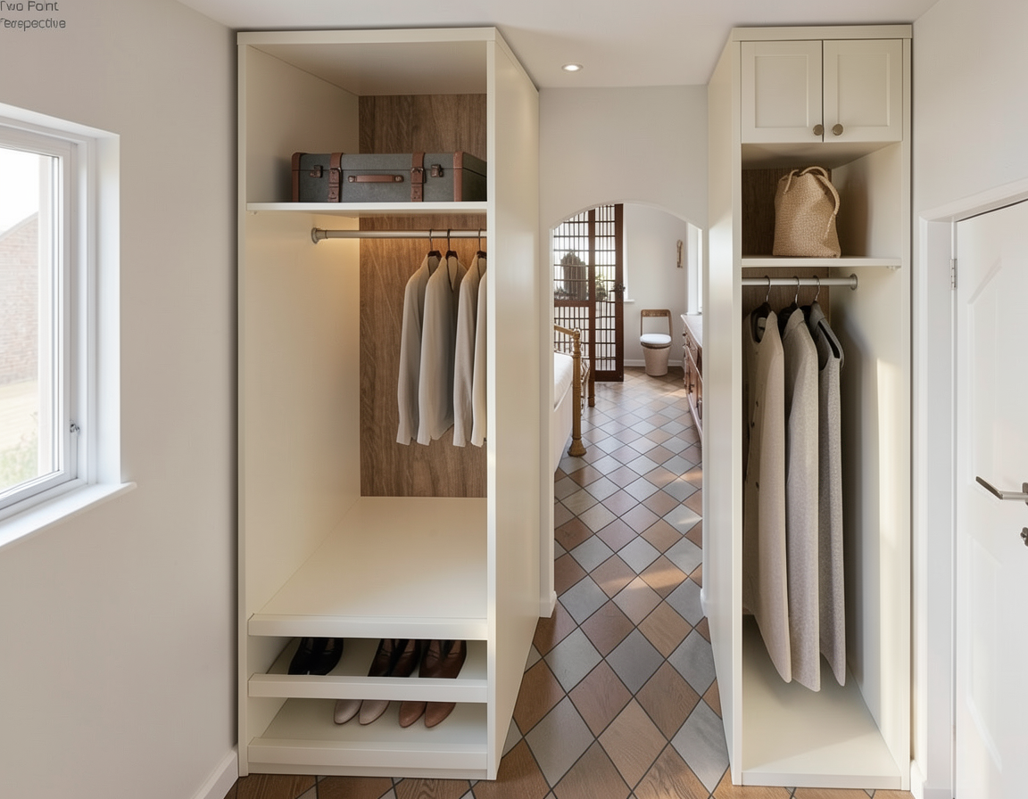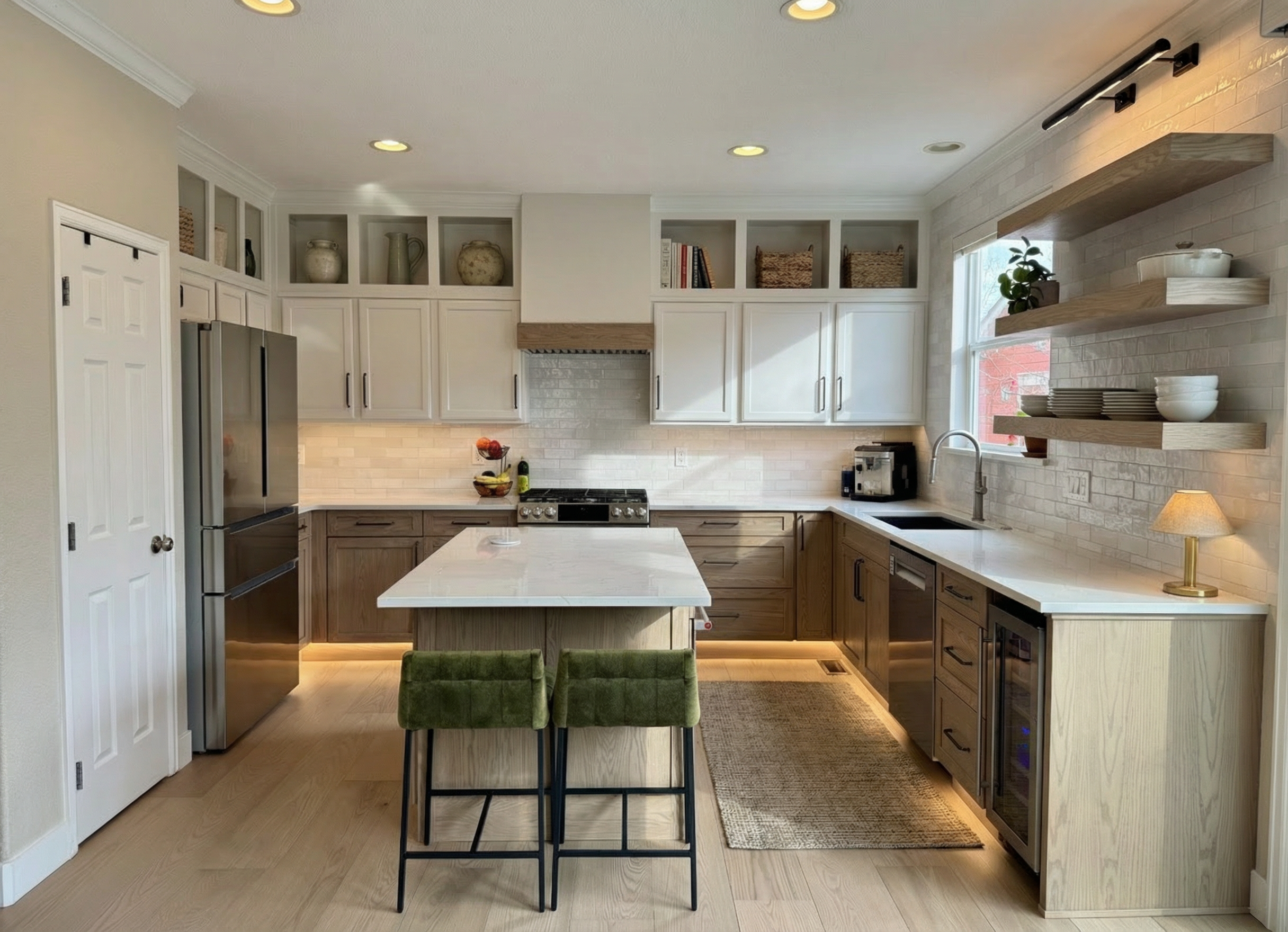 flat white panels no profile door or shaker light oak benchtop and shelves the black thing on the floor is a circular robot vacuum show some sunlight handles also to be small wooden oval 250mm long pull handes on the tall cupboards no handles on the small cupboard or drawers
