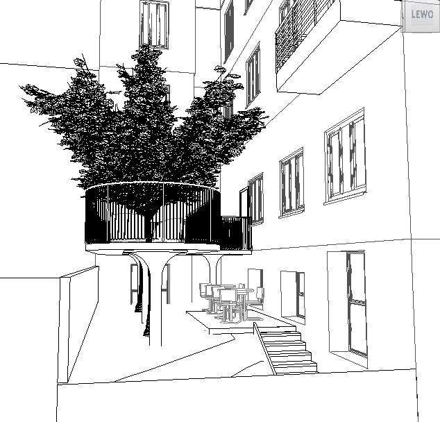 the terrace must remain clean and fully hard surfaced stone or concrete as in the original model no vegetation soil or organic elements should appear on the terrace remove the background environment and replace it with a neutral clean minimal backdrop soft gray or white studio like background no buildings landscape elements sky details or contextual scenery should be visible in the background keep grass only in the ground areas beneath the terrace if present in the original model do not modify the geometry structure proportions or elevation of the terrace or any architectural elements maintain a high end architectural visualization style with realistic lighting materials and subtle shadows