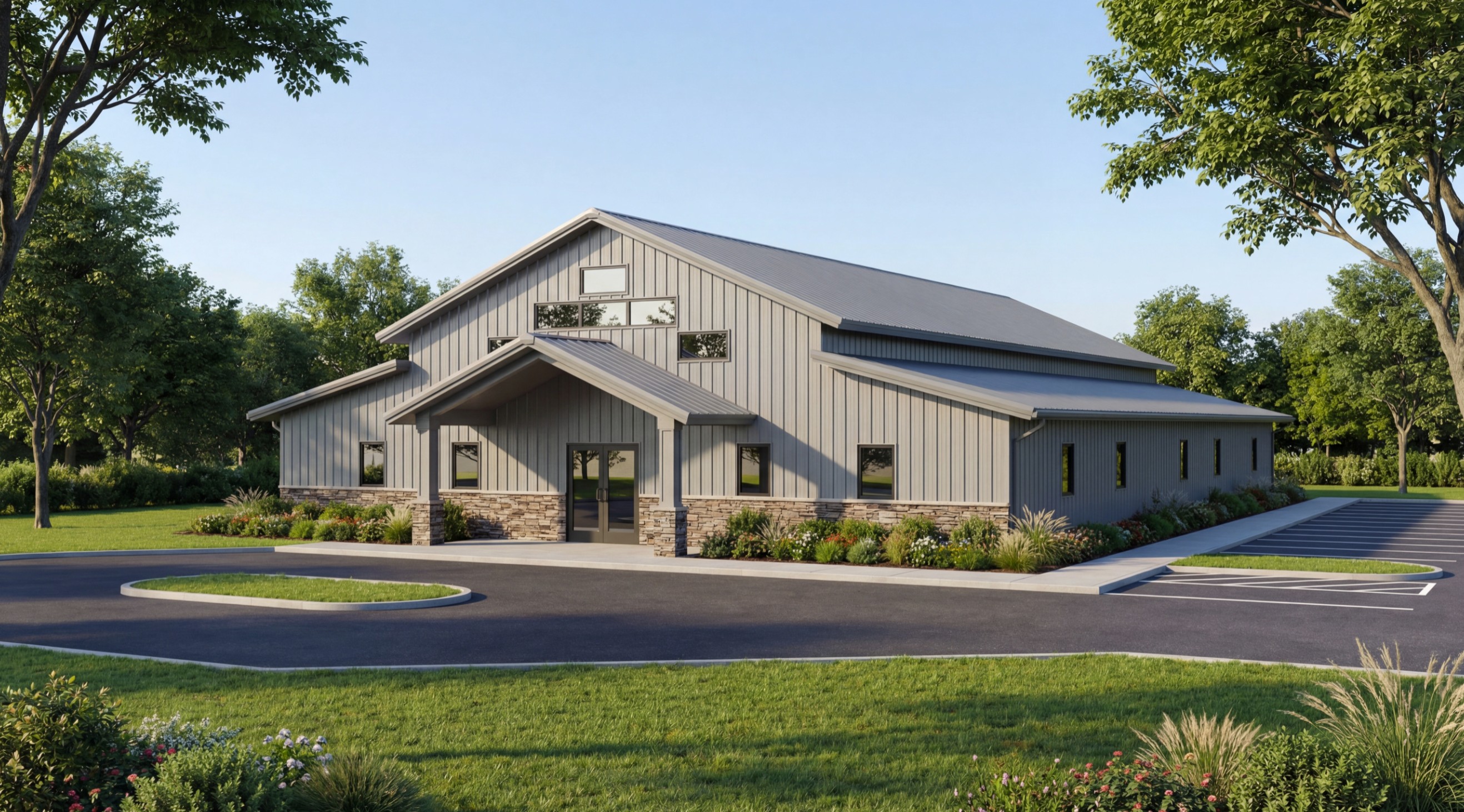 winter evening at sundown in wichita kansas light snow show interior lighting with some fog add a flagpole in the landscape island adjacent to the front entry make the sky lighter and not as dark remove the light in the island and add the flagpole