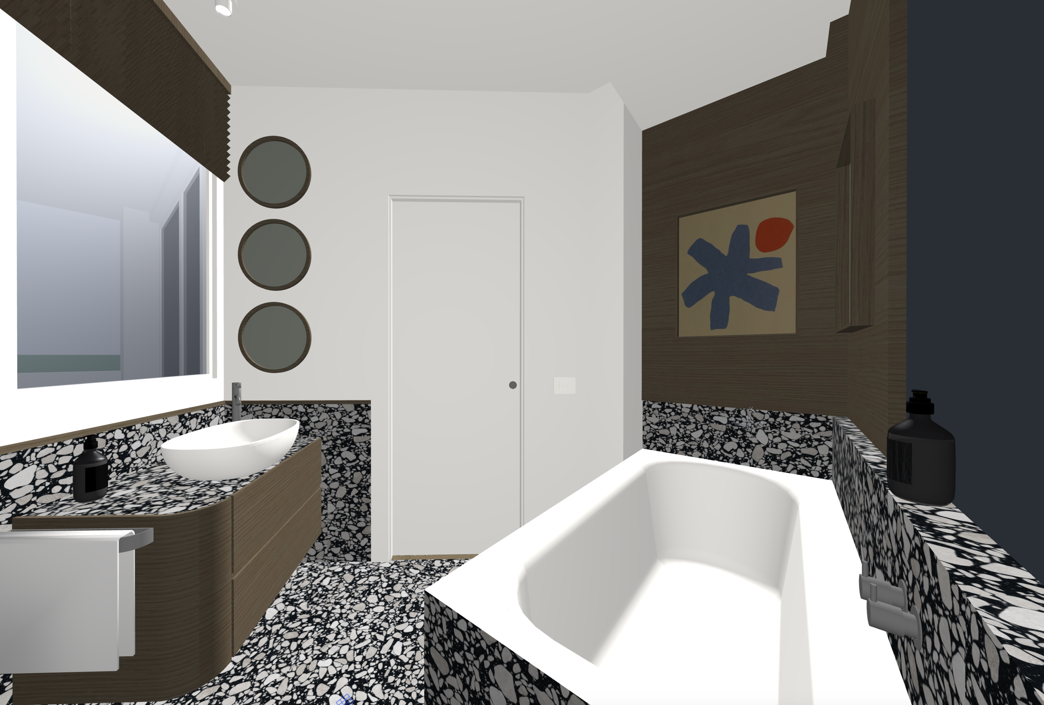 create a modern bathroom with elegant and sophisticated design the floor and partial walls are covered in a striking black and white terrazzo pattern incorporate a floating wooden vanity in a light oak finish topped with a pristine white ceramic vessel sink above the sink is a trio of round mirrors with subtle wooden frames the atmosphere is calm and contemporary with soft ambient lighting a large window with oak textured blinds adds a touch of natural light and sophistication from the window you see a building anonymous