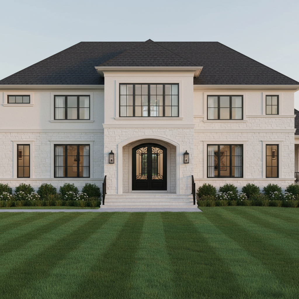 a manicured lawn layered flower beds low maintenance shrubs native plants stone pathway leading to the entrance
