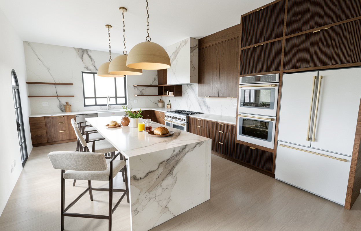 editorial interior photograph of a refined modern kitchen photographed for architectural digest soft contemporary aesthetic with warm elevated materials and natural depth walnut fluted cabinetry with rich vertical grain movement and subtle tonal variation matte finish with slight natural inconsistency integrated caf appliances in brushed stainless with soft brass accents not overly reflective honed marble island and backsplash with elegant organic veining natural not dramatic veining flows realistically across surfaces with slight variation in tone and translucency three soft brass pendant lights suspended above island warm aged finish with gentle patina pendants dimmed to a subtle glow contributing warmth but not casting harsh shadows lighting large diffused daylight source entering from one side overcast sky quality light wraps around cabinetry and softly grazes the fluted texture creating gentle shadow lines that emphasize depth balanced fill light to prevent dark corners no harsh contrast no spotlight effect shadows are soft and feathered depth is visible but calm camera eye level at approximately 4 6 35mm full frame lens slight depth of field foreground element subtly softened vertical lines straight and architectural natural perspective exposure slightly bright midtones controlled highlights gentle shadow retention filmic contrast curve warm neutral white balance around 4800k subtle vignette very fine film grain for realism styling minimal and intentional one ceramic bowl one wooden board a small stack of linen napkins nothing perfectly centered organic asymmetry avoid hdr look over sharpening glossy reflections overly dramatic veining deep black shadows showroom lighting extreme clarity mood calm layered warm dimensional photographed not rendered understated luxury ultra photoreal editorial quality