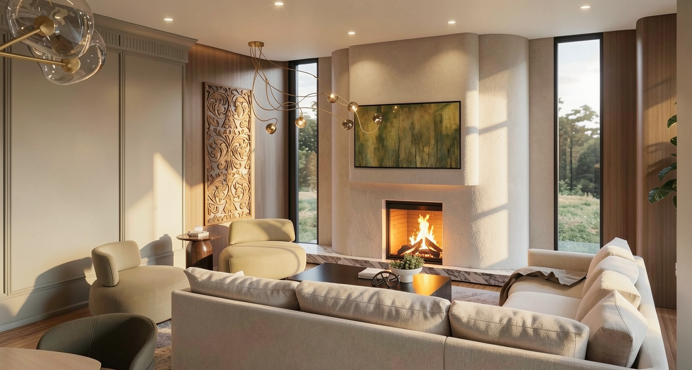 maintain this render as is including lighting except the ceiling details should be almost black stained wood the backsplash should be solid dark charcoal with soft texture all in one slab