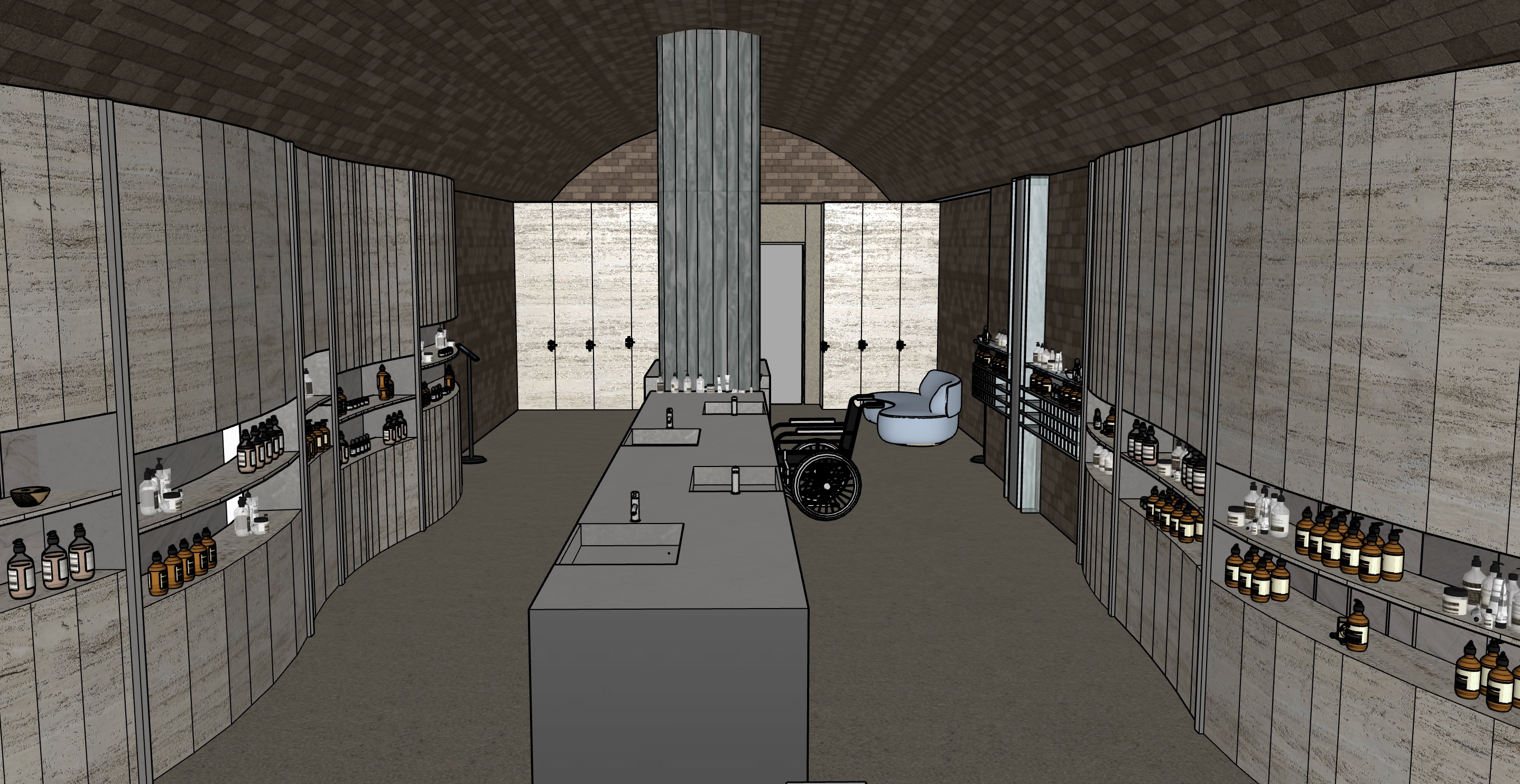 add soft day time lighting and track spot lights into the ceiling the main material on the walls is travertine the back wall is built in travertine clad cupboards the central structure is a stainless steel sink which reflects the lighting the floor is soft beige micro cement