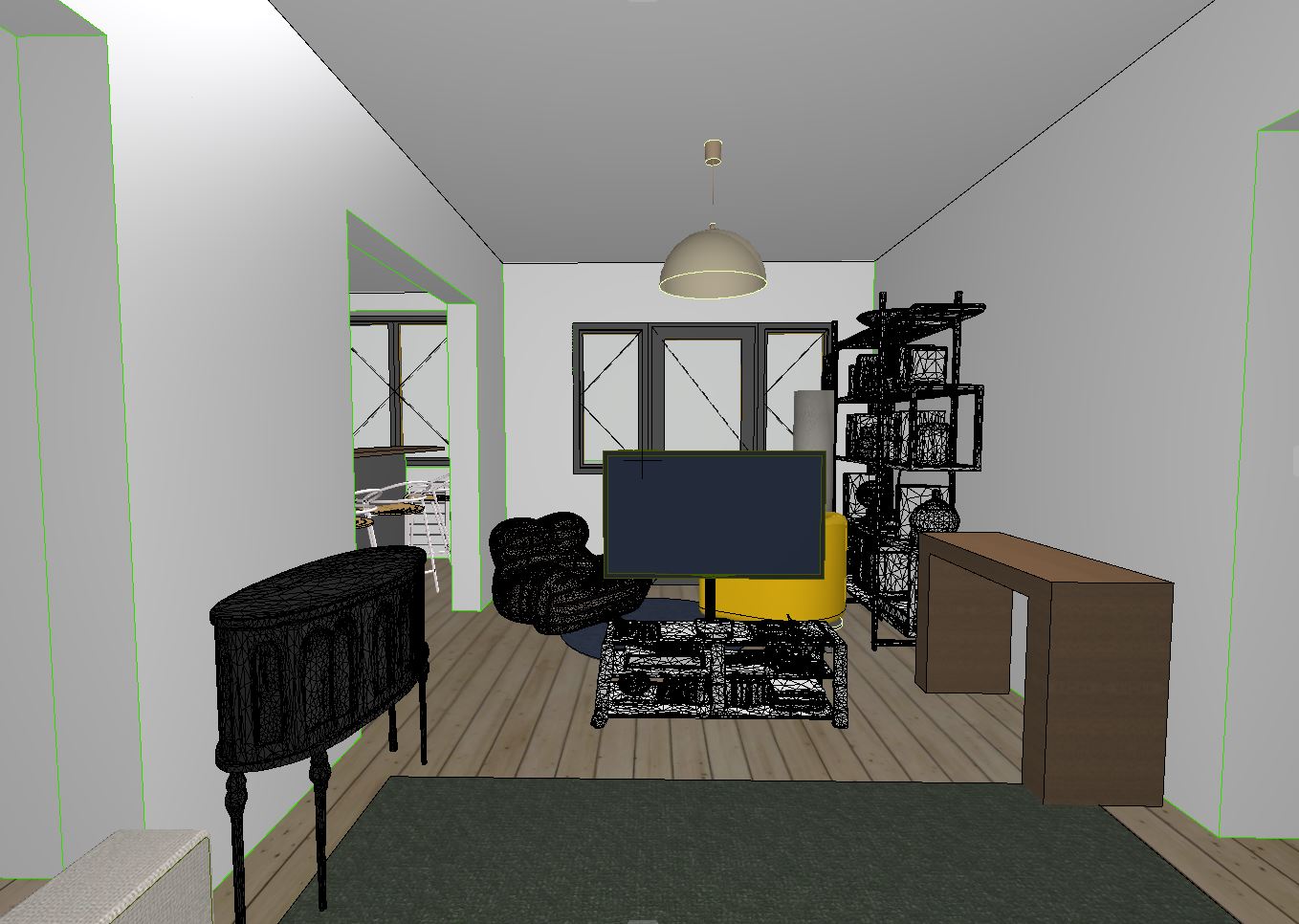 perspective shot a modern and eclectic living room abundant light entering trough the windows of the balcony on the right casting gentle shadows the walls are white with trim molding frames the skirting is also white the floor is hardwood floor natural finish the sofa and armchairs have soft materials the tv has a panoramic image of a lake the carpet is a modern design carpet the suspended light pendant is white and emites a soft warm light in the background there is kitchen with black cabinets and suspended cabinets with glass doors and black frames enhanced color richness and luxurious catalog level realism improve depth and realism ditorial style photo eye level camera angle time of day noon high detailed cinematic lighting global illumination ray tracing ambient occlusion chromatic aberration anti aliasing post processing super detailed fujifilm 16k ultra detailed