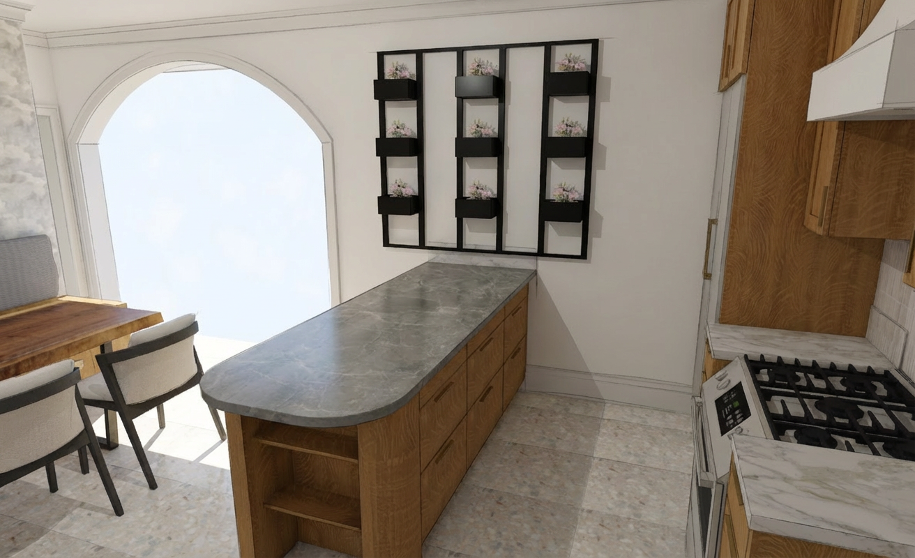ad few trees and vegetation for context add creamish interior warm lighting low brightness