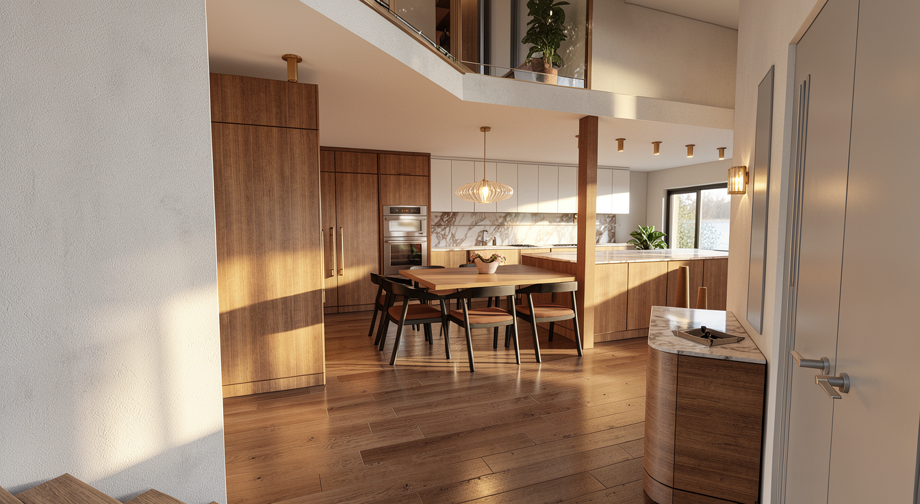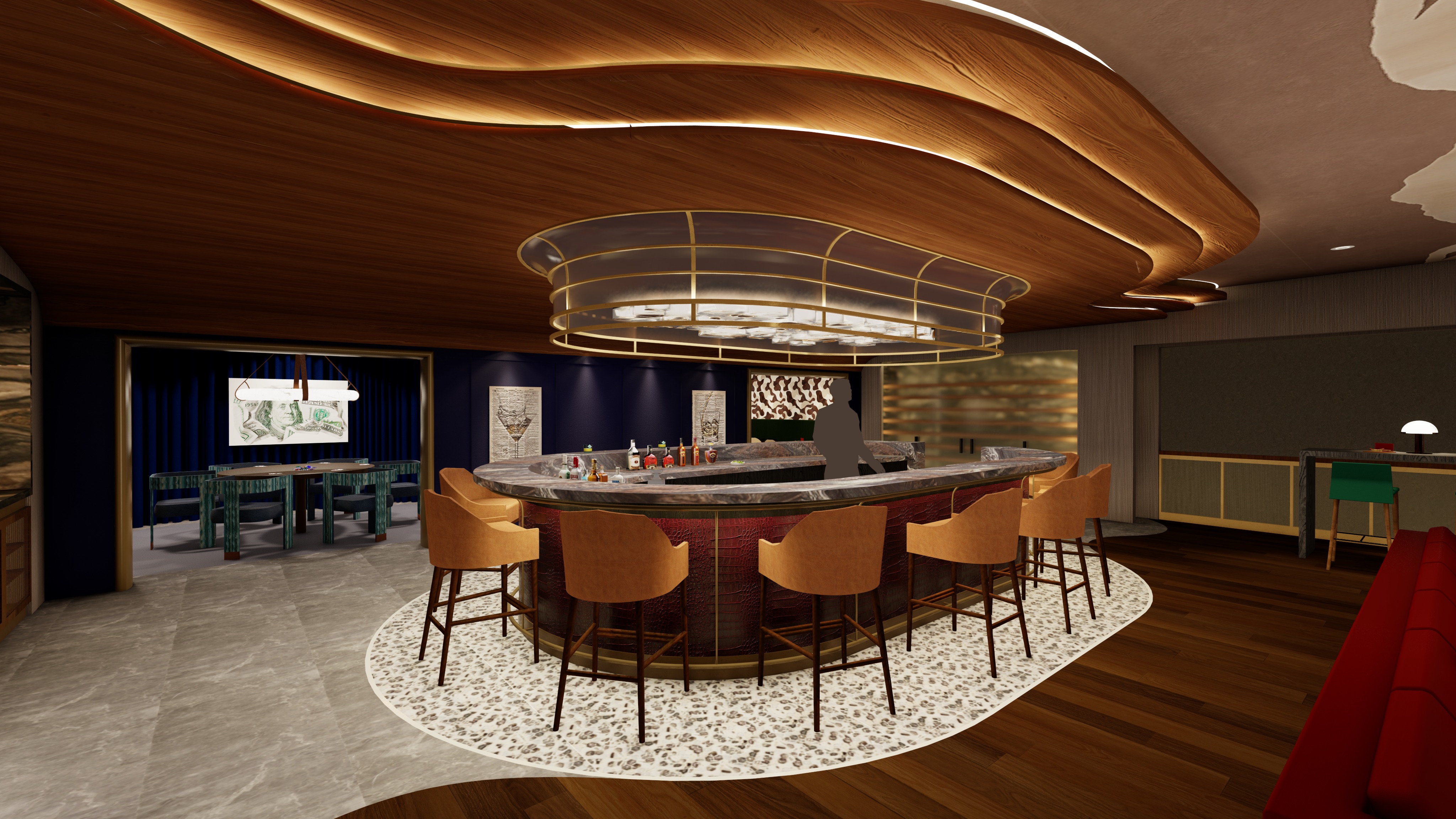 ultra realistic photo enhancement of the provided interior rendering preserve exact geometry layout proportions and camera angle keep all objects walls ceilings doorways furniture lighting fixtures and placements exactly the same in position size and shape do not redesign reinterpret or modify any elements do not add or remove anything do not change materials into different designs only improve the realism of the existing materials convert the rendering into a fully photorealistic image while maintaining 100 percent visual accuracy to the original design improve material realism using physically accurate pbr textures enhance lighting with realistic global illumination and natural light falloff add accurate reflections and refractions based on existing materials improve shadows with soft natural contact shadows add very subtle real world imperfections such as slight wear and micro texture variation improve depth contrast and dynamic range lighting should be darker moodier and more atmospheric slightly reduce overall brightness while keeping all details visible emphasize warm low level ambient lighting with a cinematic luxury lounge feel increase contrast between light and shadow for depth light sources should feel soft and indirect not harsh or overexposed render as a photorealistic ray traced image with real world camera exposure and white balance slightly underexposed for a moody tone maintain sharp detail with subtle natural lens softness no stylization no artistic reinterpretation if any element is unclear keep it exactly as shown in the original rendering without changing it