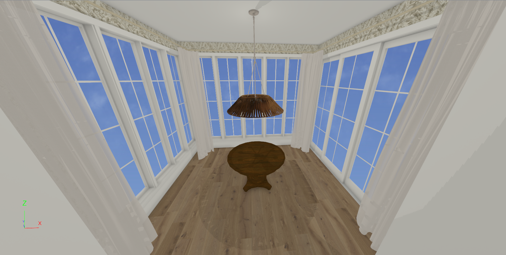 add hydrangea gardens outside windows and nice green backyard in the distance the lighting fixture is the corinne 44 from visual comfort lighting add chairs and decor