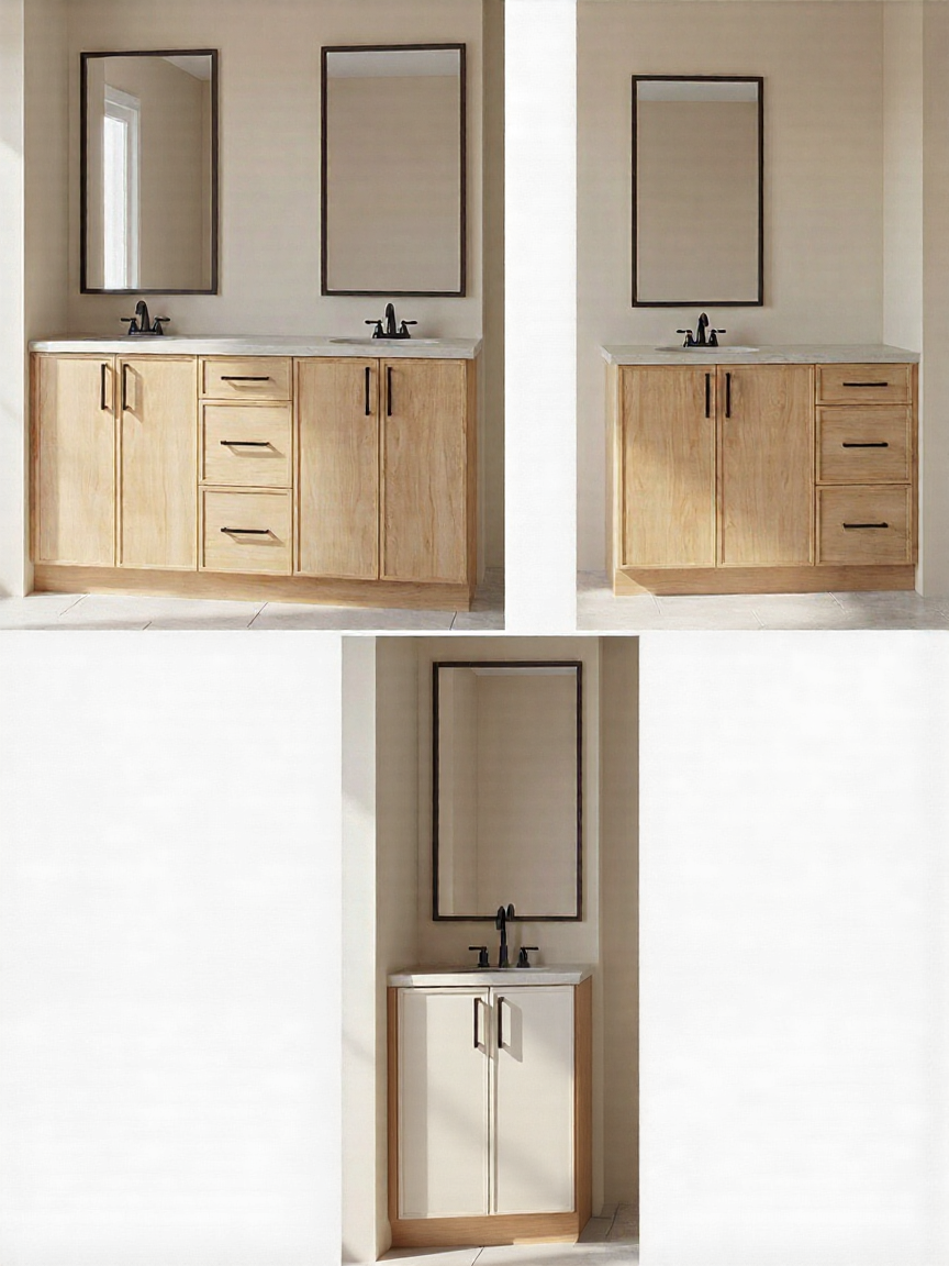 make top 2 cabinets light maple with black handles and bottom vanity cabinet entirely white including sides and bottom with black handles