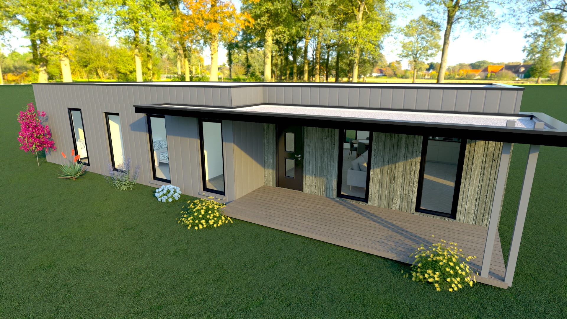 render a modern angular house with dark grey steel panel corrugated siding and sand colored vertical shiplap panels the doors and windows are sleek with dark frames set against a lush green lawn and surrounded by neatly trimmed vibrant bushes in the background create a dense forest with tall trees exhibiting a mix of bright green and warm golden leaves the atmosphere is serene and basked in soft warm evening light casting gentle shadows across the scene