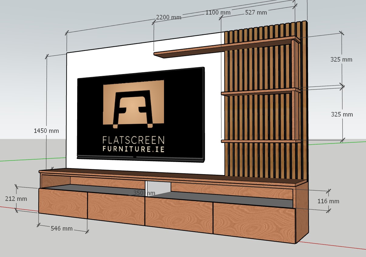 this is a sketchup model of a wall mounted tv unit the tv is a 50 tv use the provided sketchup model as the exact base do not alter structure proportions or layout ultra photorealistic interior render of a contemporary living room tv unit wall built in cabinetry in natural oak with vertical grain matte black feature panels and integrated warm led strip lighting soft natural daylight entering from the left side creating realistic shadows and depth eye level camera 35mm lens straight on composition highly detailed textures realistic wood grain subtle imperfections global illumination soft shadows premium architectural visualization quality