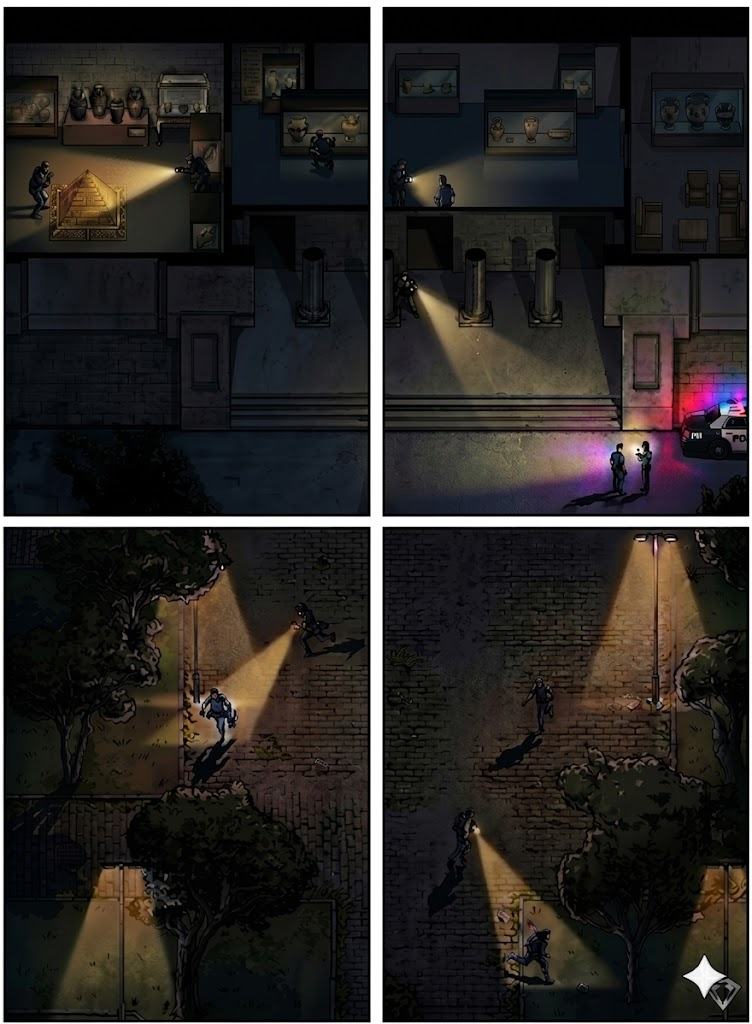 generate this image with 4k ultra high definition quality featuring exceptional clarity sharp details and photorealistic textures taake into account that the event happensa at night and with the lights inside the museum off in darkness