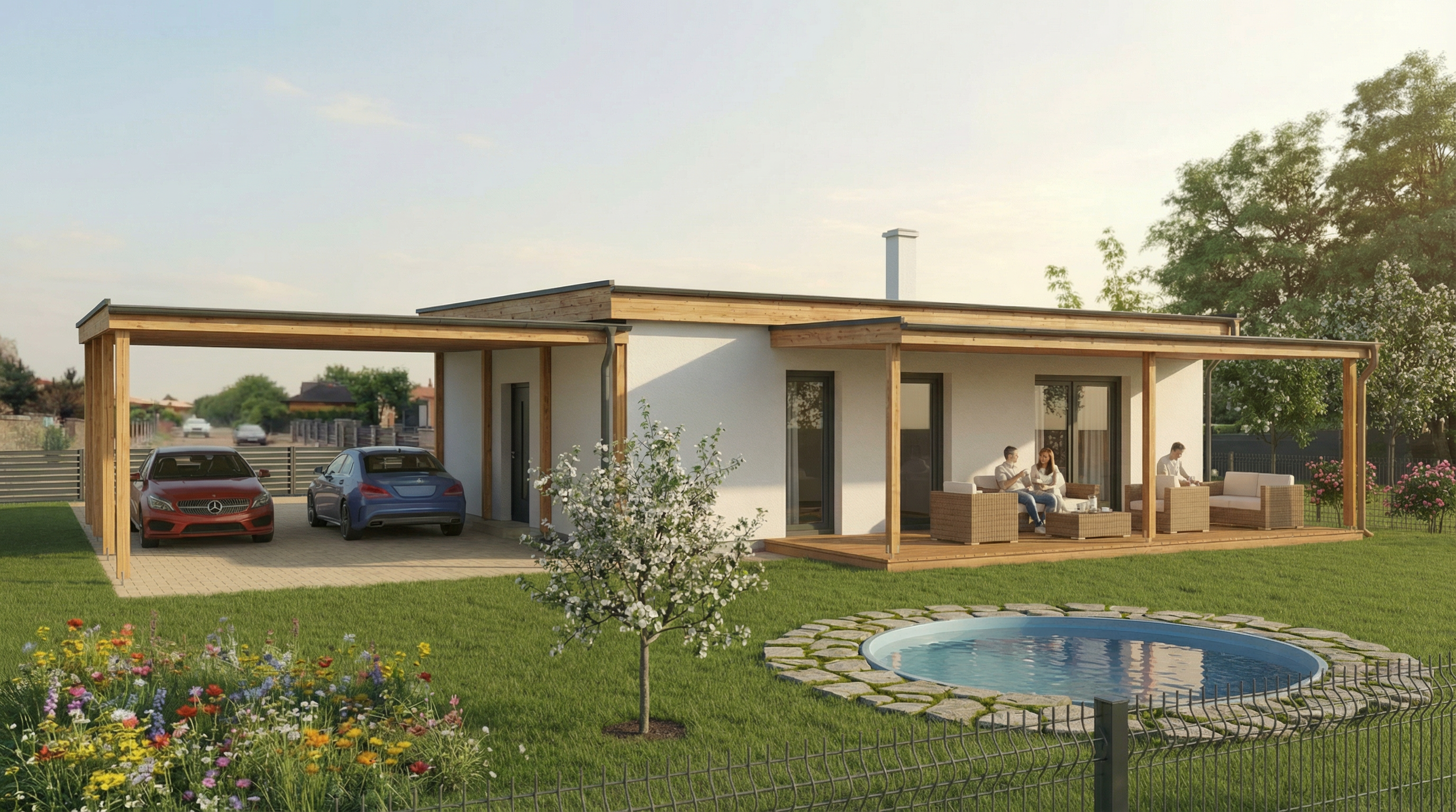 render a modern two story house atop a hill featuring sleek white and gray concrete walls