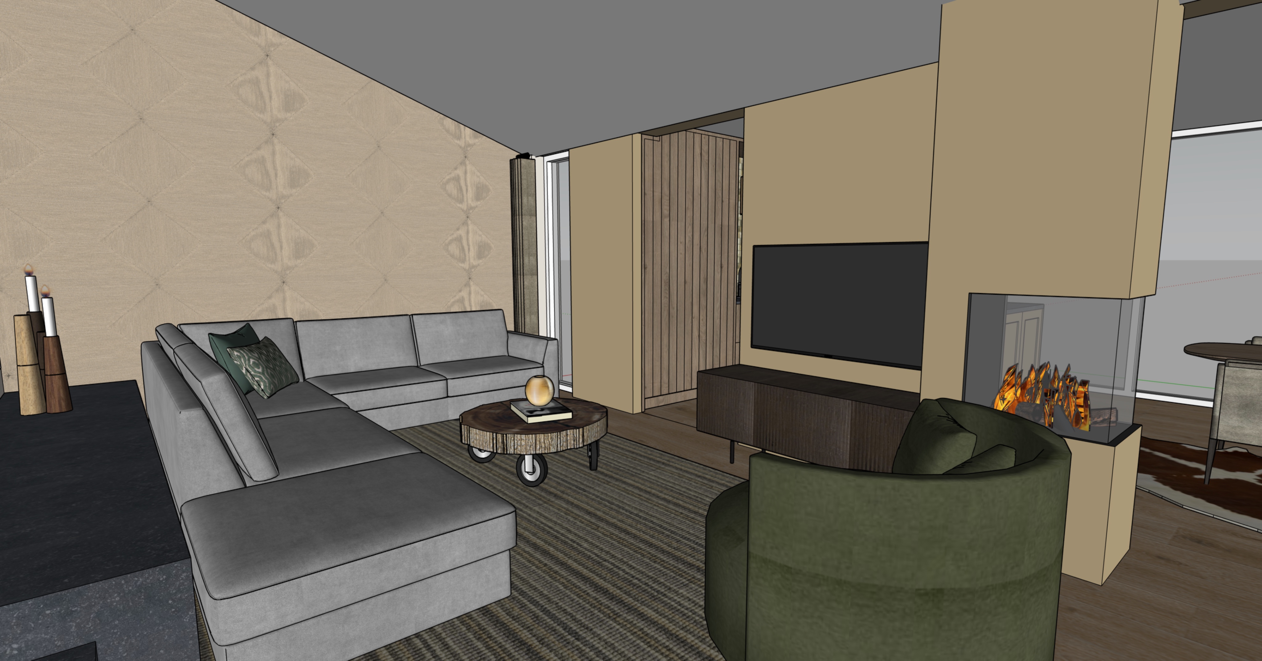 render of 3d model turn on the fireplace natural light coming trough the window in the back