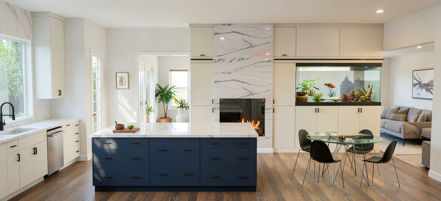 make photo realistic make perimeter cabinets soft white while keeping the island navy blue please create a foyer through the left doorway and a large living room through the right doorway just as background the fish tank with see through from the kitchen to the living room and is visible from 3 sides