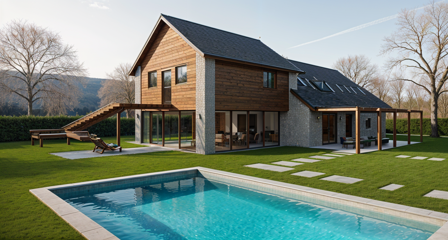 render a modern minimalist house with a bright white stucco exterior accented by light gray trim the roof is a soft terracotta color large arched windows with clear glass reflect the soft warm glow of the sunset sky the scene is bathed in golden hour light creating a serene tranquil atmosphere add lush greenery around the base with vibrant green grass and a few small bushes for a natural touch under a clear blue sky walway towards the entrance