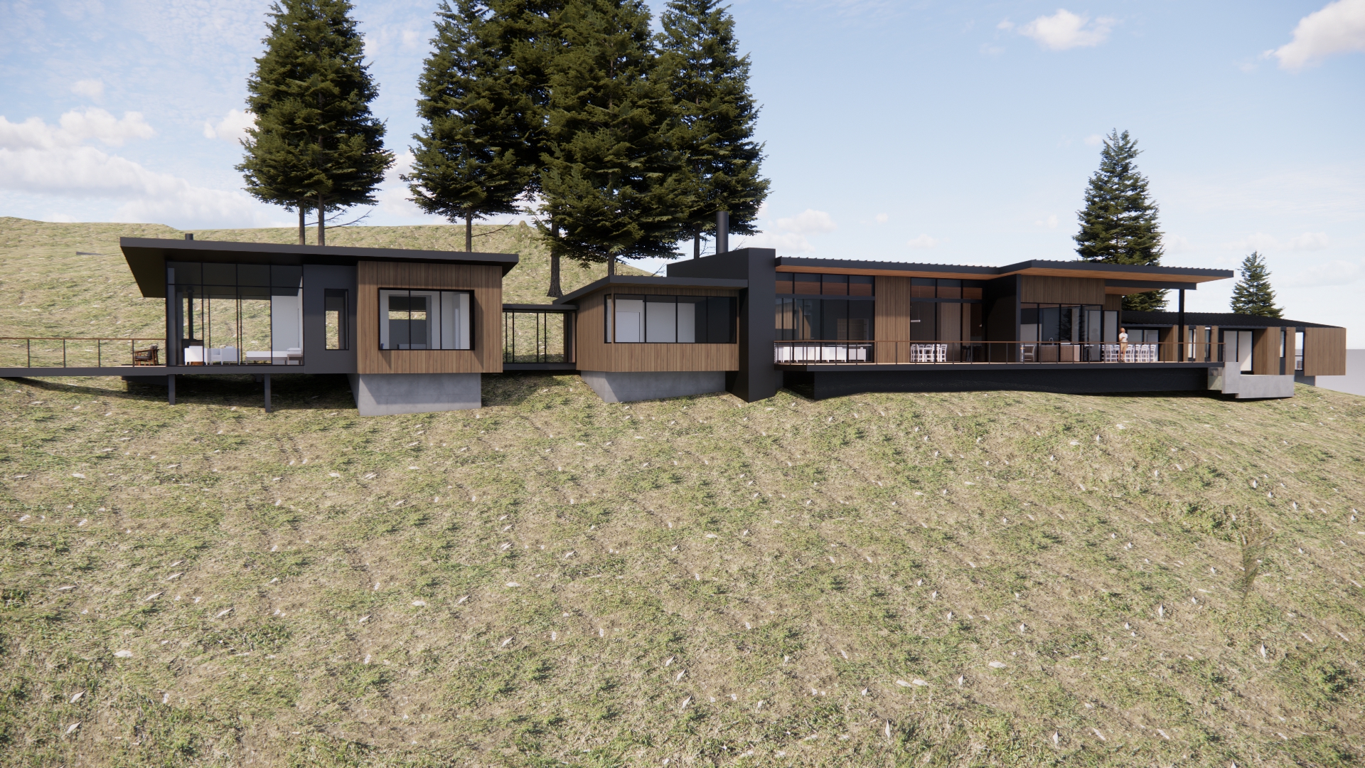 winter scene with snow glowing light from interior add granite boulders in landscape and ponderosa pine trees