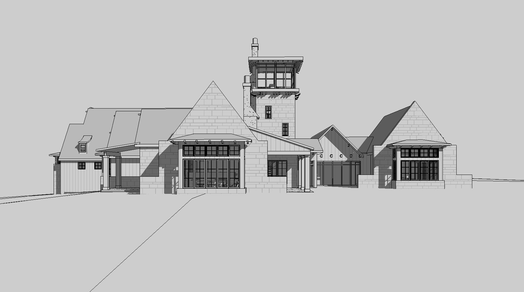modern farmhouse rustic stone gables vertical wood siding stone tower large glass windows tall grass foreground