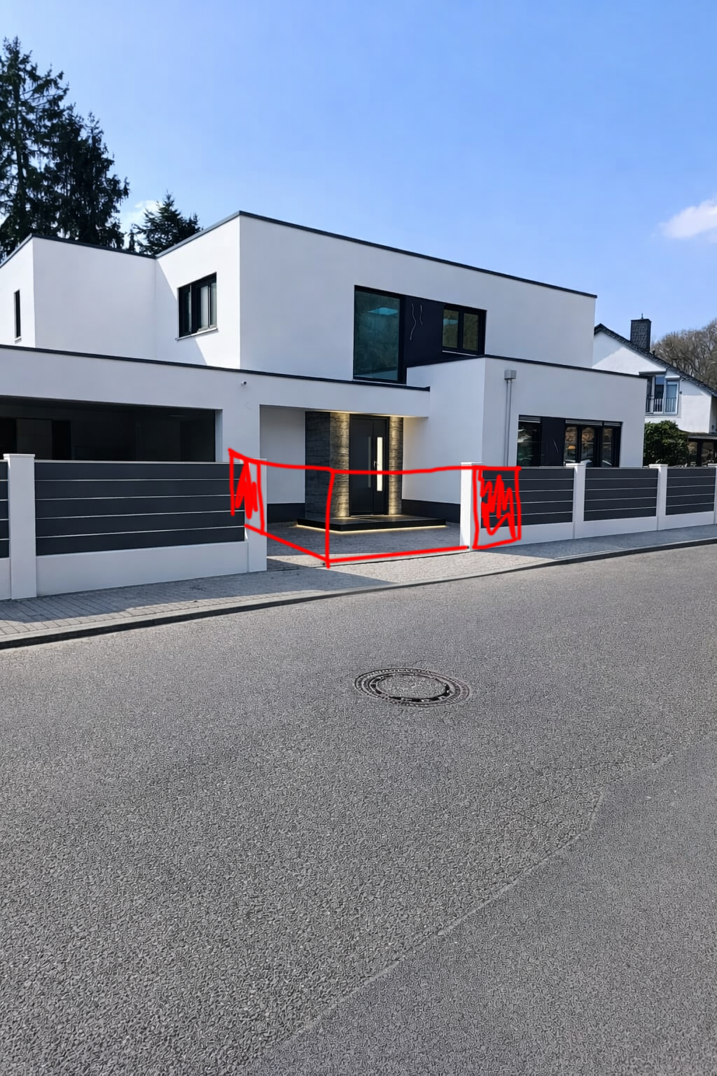 die zaunanlage verl uft so wie ich die mit roten linien gezeichnet habe mit 90 winkel zum haus die garage bleibt frei offen die gestrichelte rechtecke sind die personent rchen mit freisprechanlage und kamera