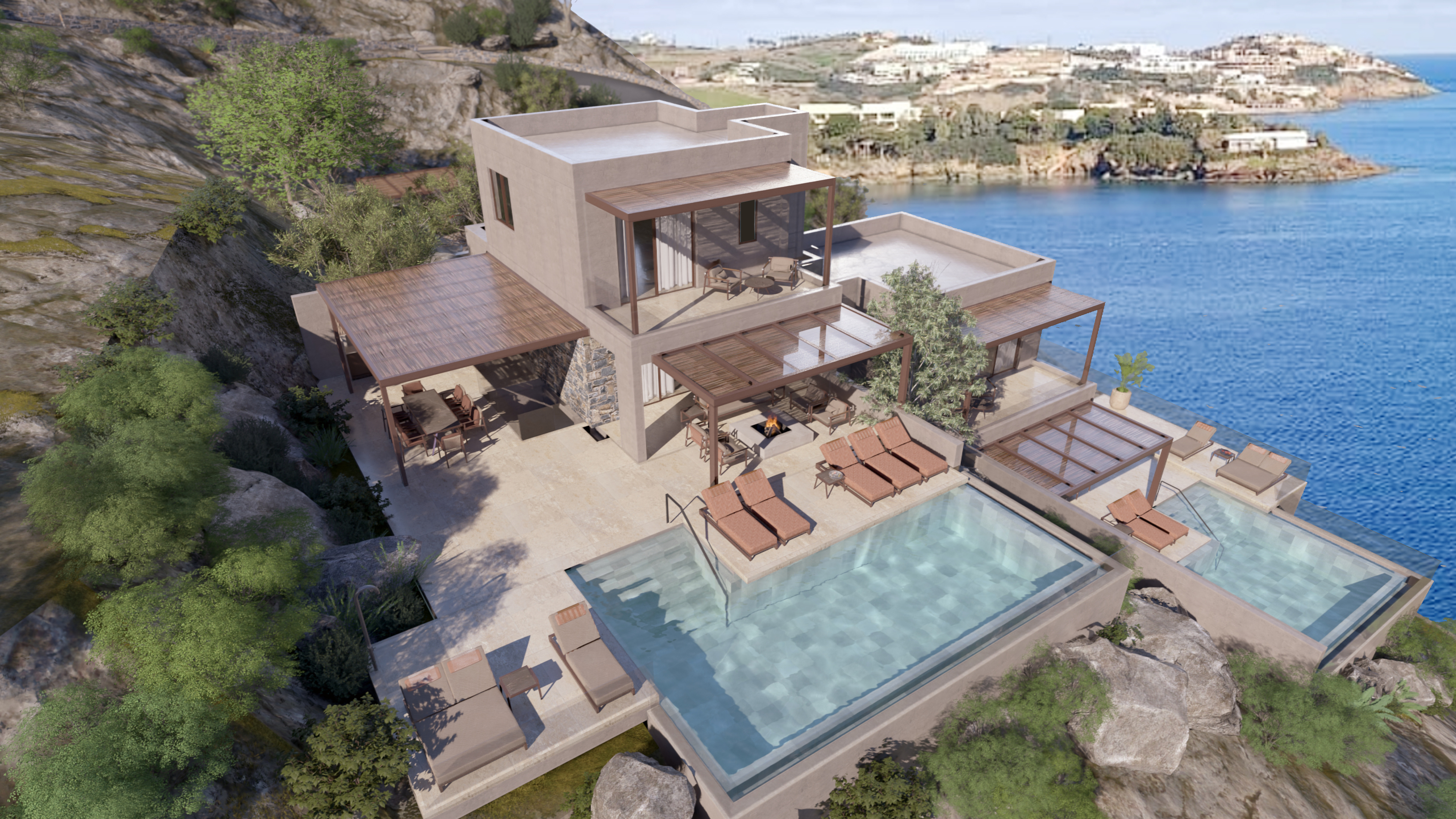 hyper realistic golden hour image of a villa on the edge o a mountain next to the aegean sea with a sparkling blue swimming pool hanging over the mountain