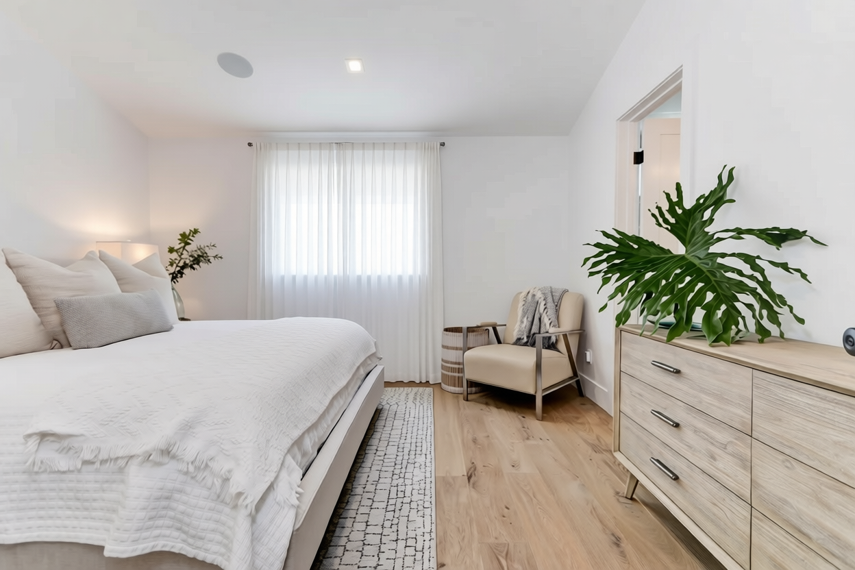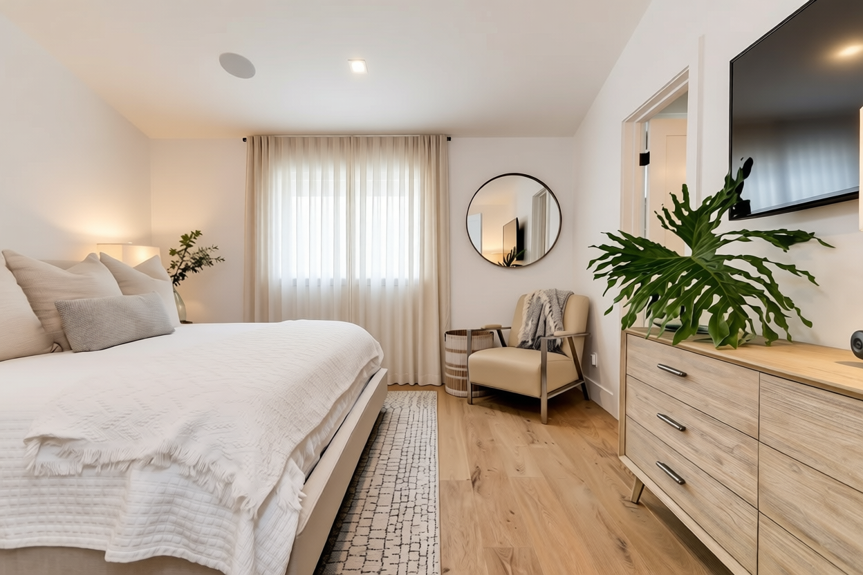 add full height very full white linen drapery panels at the window remove the round mirror on the wall