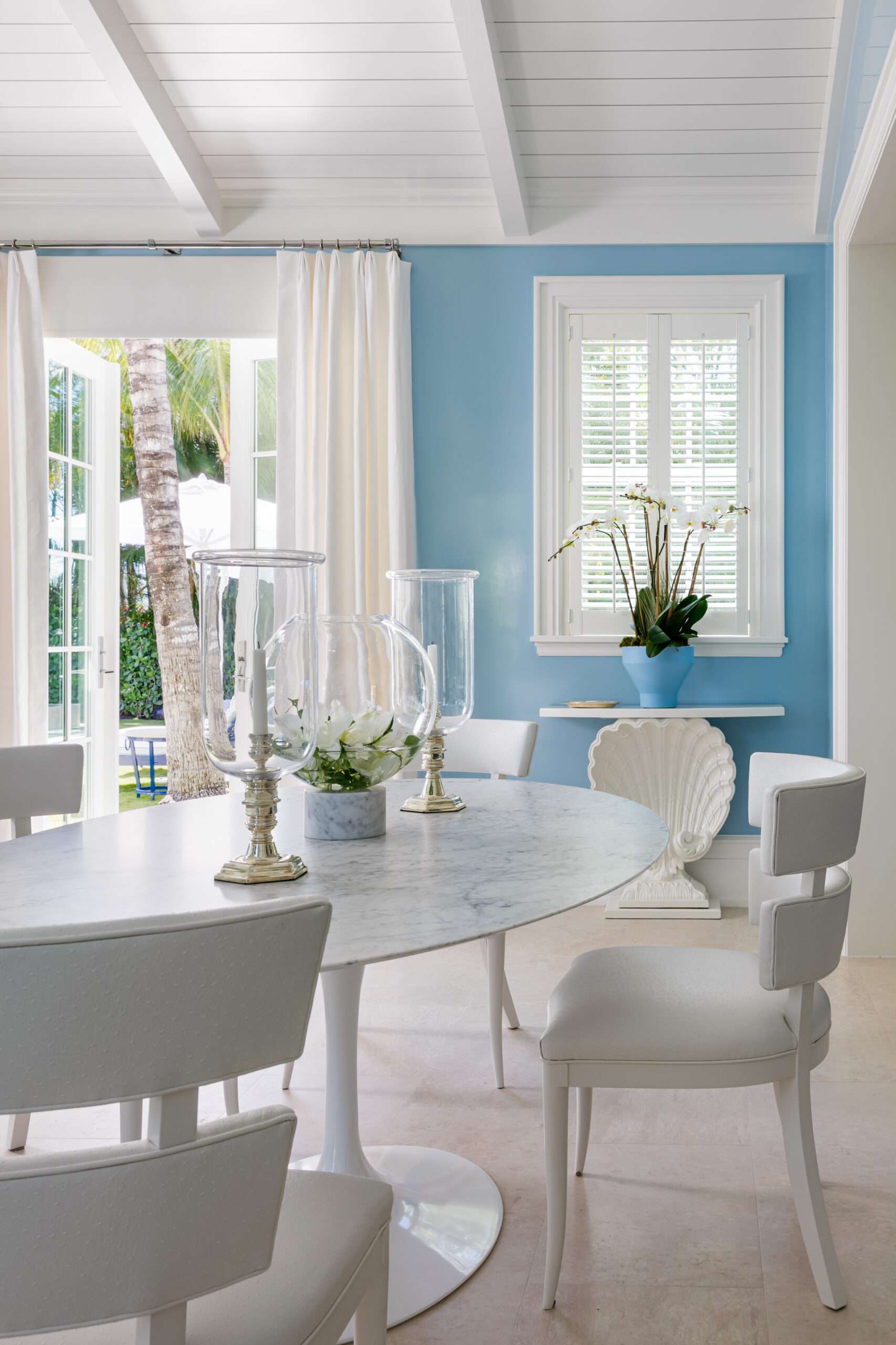 interior shot coastal modern great room that includes an open concept kitchen in the background a dining room and living room the ceiling is a white painted wood beam with white painted planks in between the floor is a light oak wood plank the kitchen windows have a view to a lush tropical garden and the large opening is a large slider with view to a pool deck and a tropical garden fit for florida