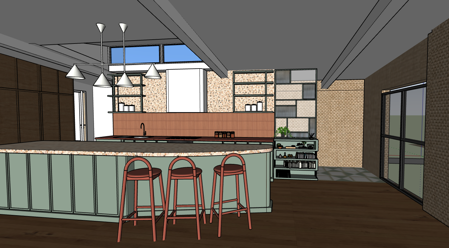 modern kitchen with a spacious layout large island with terrazzo countertop and soft mint green cabinetry elegant pendant lights in matte white hang over the island warm brown wooden flooring and accent walls light beige textured walls with a subtle pattern open shelving displaying minimalistic decor with plants large windows allowing natural light creating a bright and airy atmosphere three rose colored bar stools with a sleek design mid century modern style inviting and sophisticated