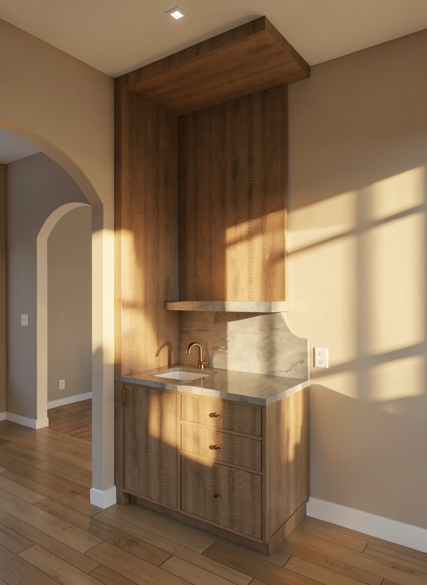 a kitchen rendering with this granite as the countertop and backsplash focus on the island area apply high end fixtures for an editorial magazine advertisement