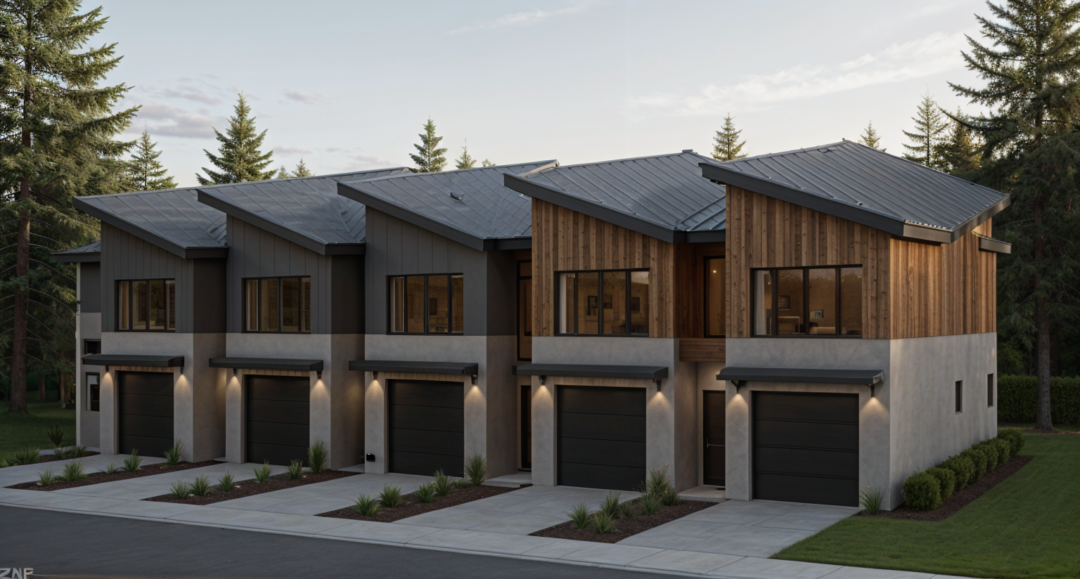 colonial revival exterior shot only the middle building is re painted the sidewalk and driveways remain as they are the middle building is dark paint a flowering vine grows up the staircase railing architecture