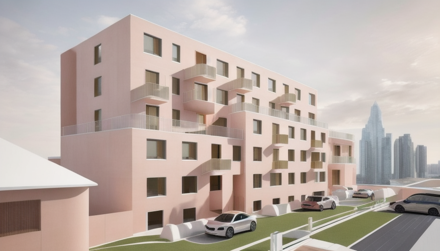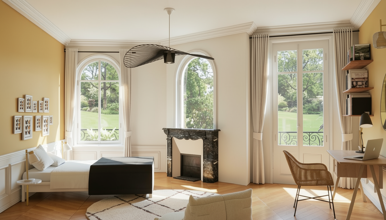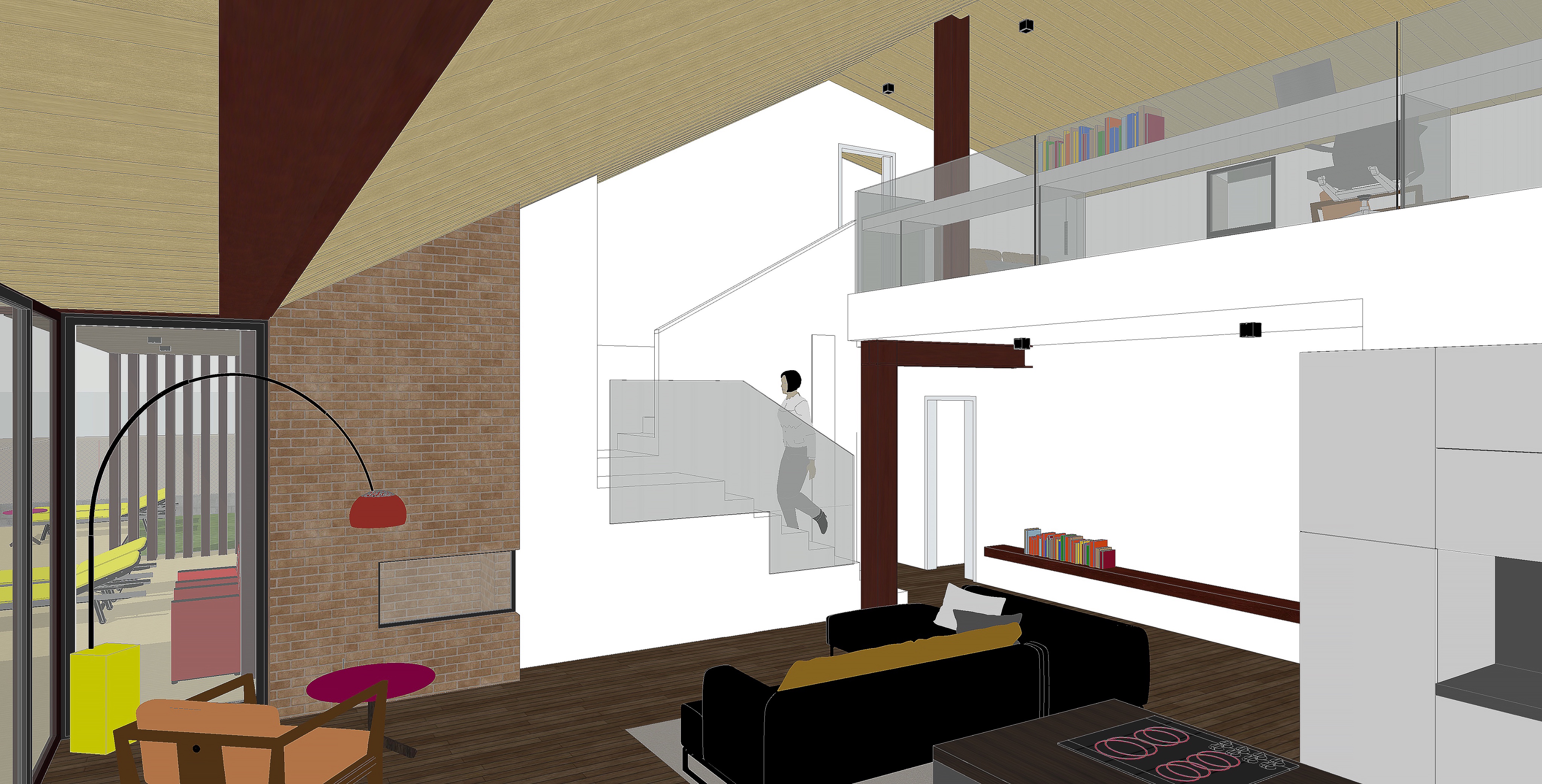 immagine realistica di un uno spazio living a doppia altezza fedele a un disegno progettuale grande open space con soffitto inclinato in legno e travi strutturali a vista parete in mattoni faccia a vista volumi bianchi e superfici pulite soppalco con parapetto in vetro e scaffalature integrate scala leggera che collega i livelli area living con divano scuro e cuscini chiari cucina con isola in primo piano dettagli d arredo contemporanei come lampada ad arco e poltrona pavimento in legno continuo equilibrio tra struttura e arredo atmosfera calma