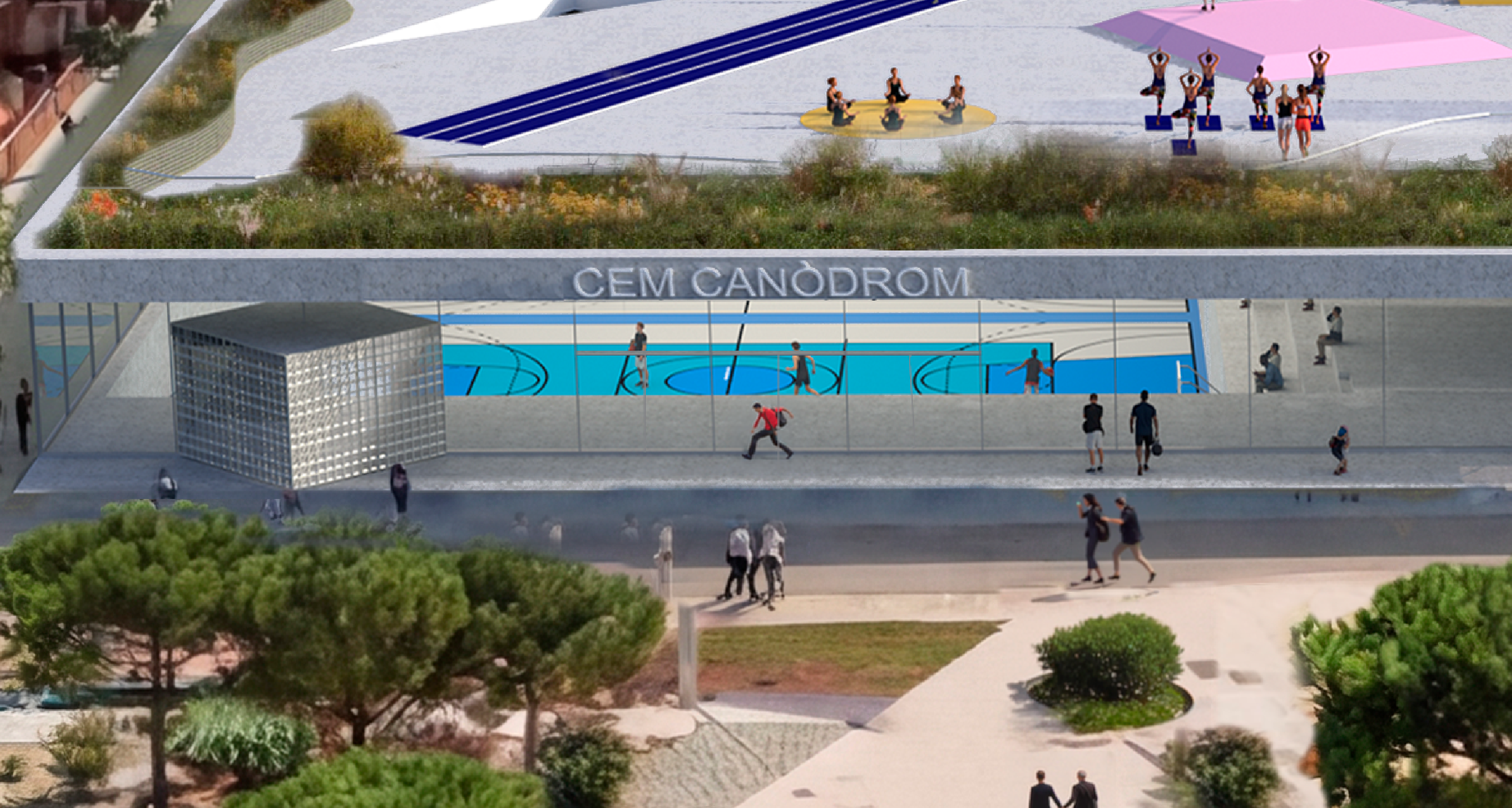 make one of the doors open improve the continuity of the street so that no strange shadows or blurry things are visible also add furniture with people inside the building and people walking towards the entrance