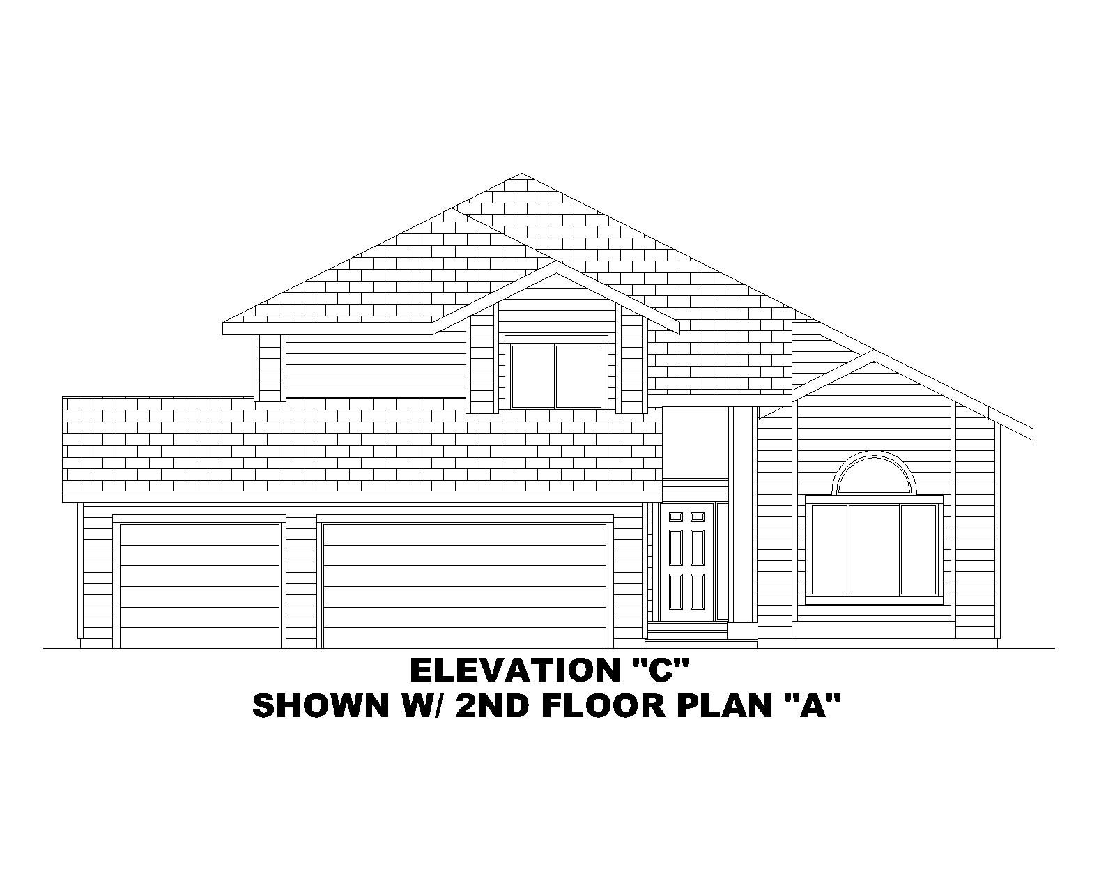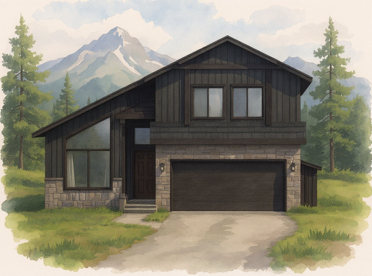 grainy watercolor render of modern farmhouse styled home with blue paint stone accents include trees and mountainous alaska environment in the background simple driveway and walkways in front of the home