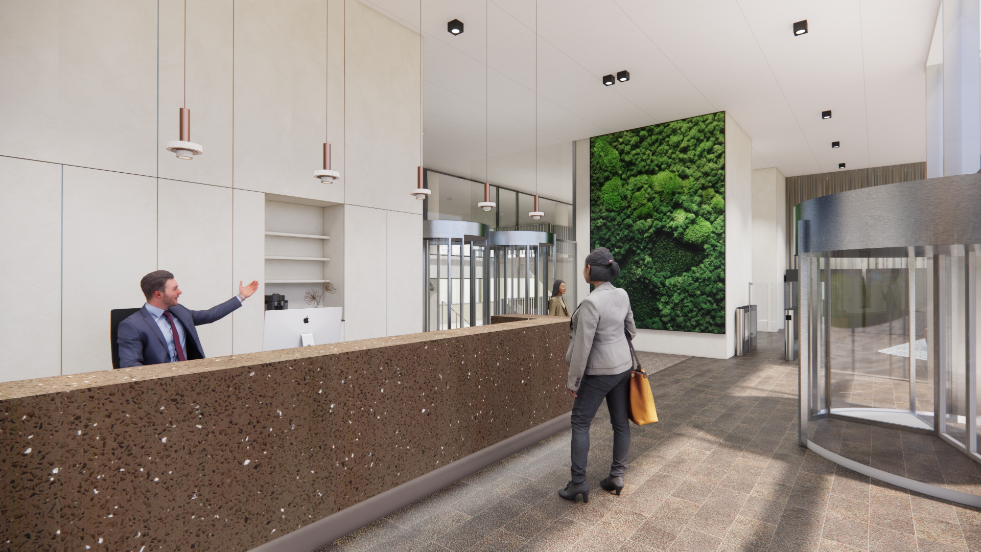 change the finish of the reception desk to a medium warm dark wood enhance natural light to a sunny day exchange the curtains at the back to an even dark grey blue painted wall