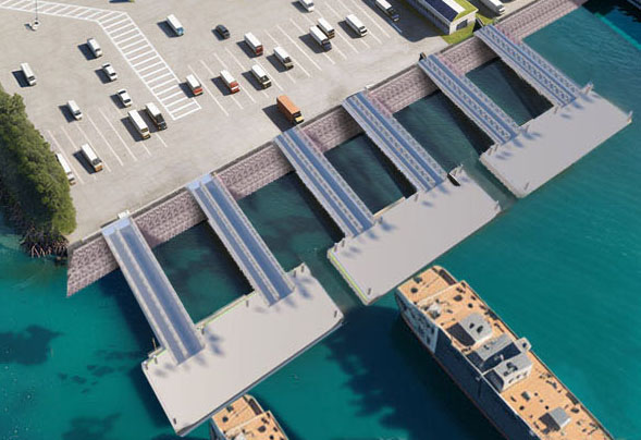 you can see three barges of a roro terminal with six truss bridges each barge has eight spud legs please add container trucks on top of the barges and workers operating on them the scene should look realistic and industrial like an active port terminal