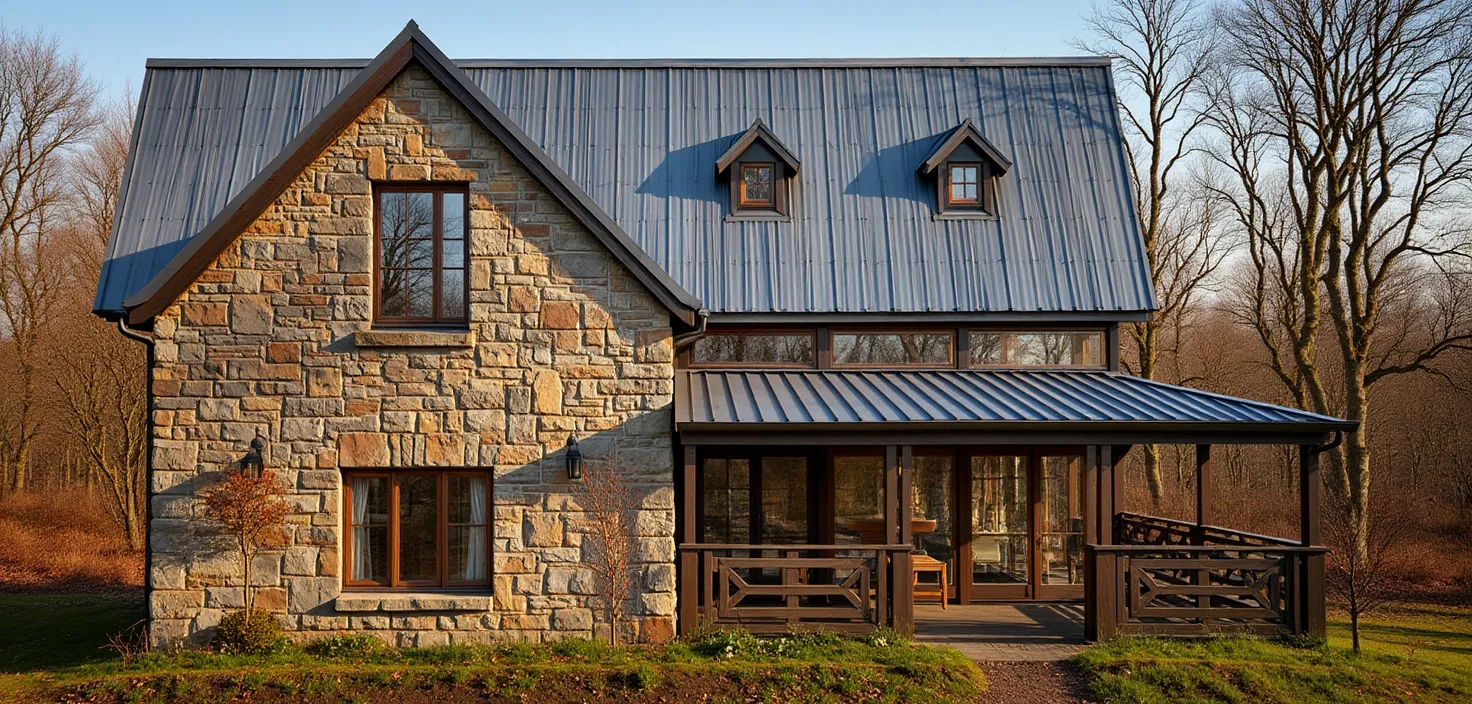 english stone cottage in the woods no dormers open truss in gable stone and wood tones architecture