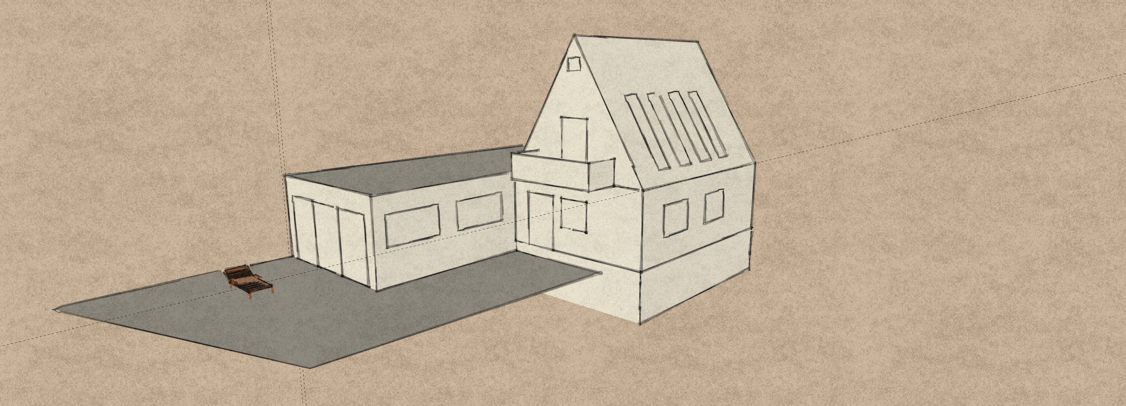 constructivism exterior shot render a modern two story house with an a frame roof and a flat roofed extension the main building is a soft cream color with dark gray roofing large windows and a small balcony enhance the front facade there s a cozy wooden bench on a sleek gray concrete patio the atmosphere is serene and inviting with warm golden sunlight casting gentle shadows creating a harmonious blend of aesthetics and warmth architecture