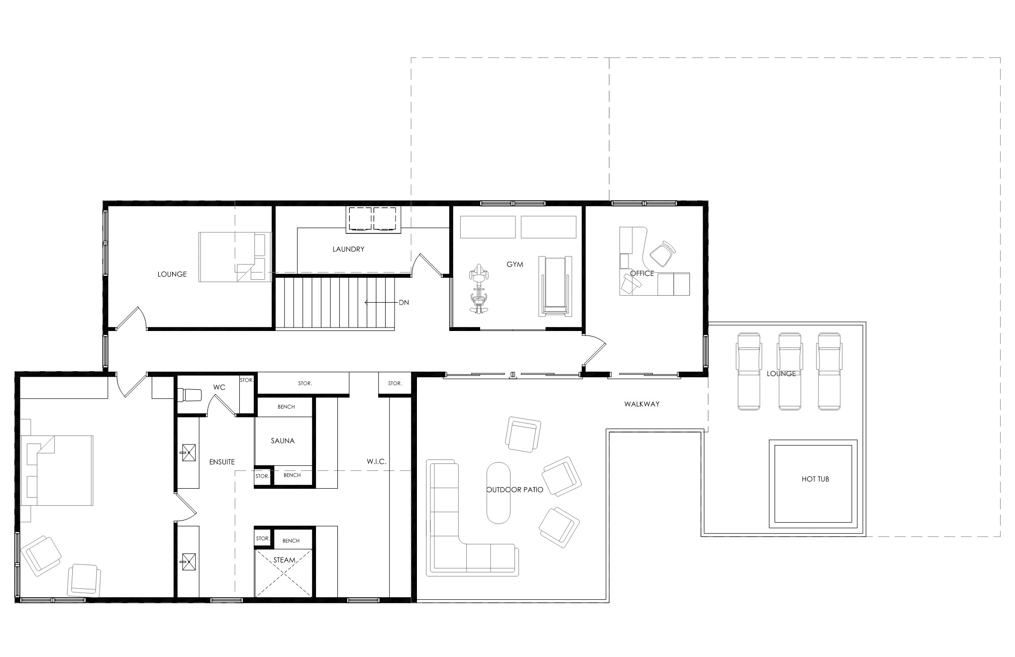 convert this floor plan into a realistic isometric 3d view of a full house show the space from an elevated angle with furniture walls and details visible moody but light colours windows have thin black frames large format tiles throughout furniture should have some colour and comfort use the same furniture as shows on the plan do not change the orientation of the floorplan