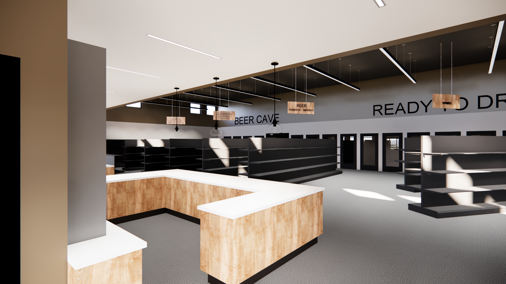 liquor store with exposed steel structure check out stations polished concrete floors reach in coolers