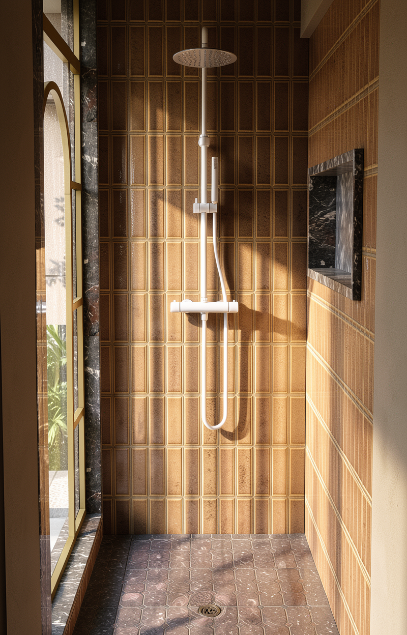 photorealistic interior render based on the uploaded bathroom photo important do not change the room layout walls ceiling windows doors tiles vanity cabinet countertop sink faucet mirror size or position keep the exact same camera angle proportions materials and color scheme only add pendant lights using the existing ceiling wiring points visible in the photo install two brushed brass pendant lights with small white opal glass globes one on each side of the mirror symmetrically aligned with the sink and mirror edges specifications brushed brass stem opal white glass globe 12 16 cm diameter drop length 25 35 cm warm white light 2700k soft luxurious hotel style lighting realistic mounting hardware realistic shadows and reflections in mirror no harsh glare everything else must remain identical to the original photo