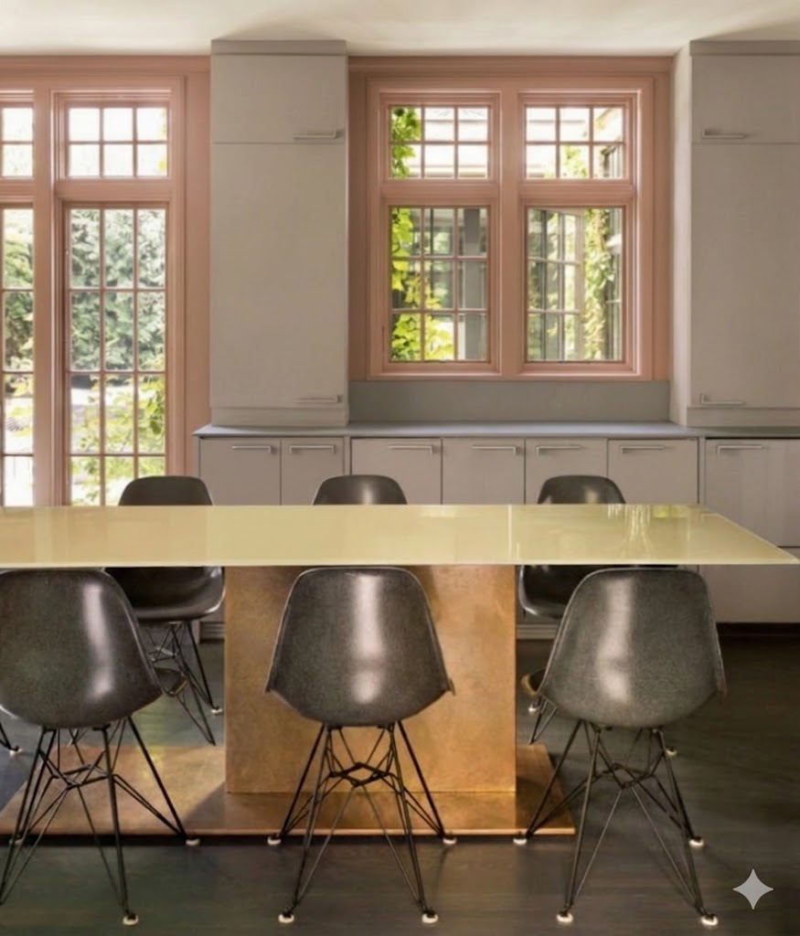 change table to oval shape with white oak and medium brown stain change chairs to dark grey upholstery with upholstered legs
