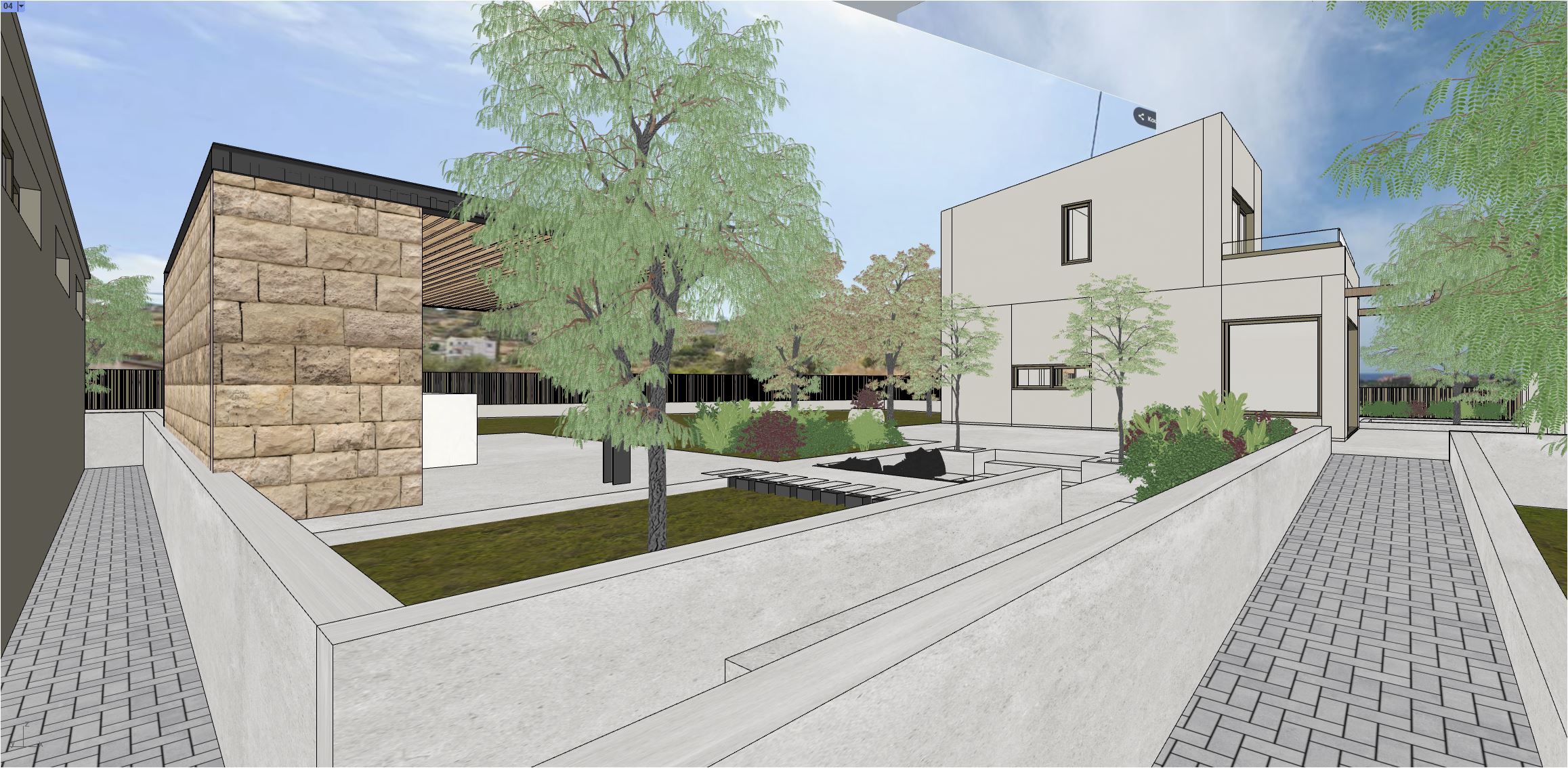 exterior render into a photorealistic summer house in greece keep exactly the same geometries and materials on everything do not change the material of the corridors paths camera view do not change proportions or architectural layout use warm mediterranean summer light late afternoon feeling curtains behind windows natural plants style modern greek summer house minimal calm elegant use realistic architectural photography 24 35mm lens natural colors soft shadows high realism clean composition professional architectural visualization