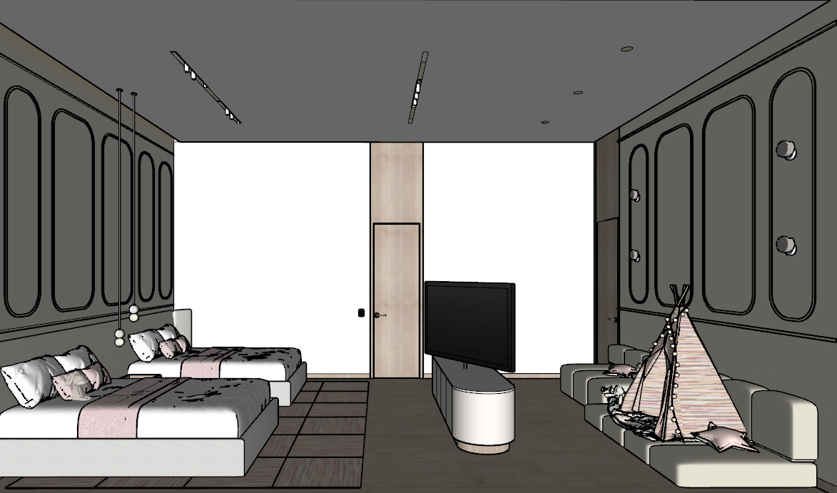 modern minimalistic bedroom emphasizing a cozy and inviting atmosphere two large beds are adorned with white bedding and pastel pink throws complemented by light gray and soft pink pillows for a touch of color the walls are a soft cream providing warmth and contrast to the white ceiling the floor is a wooden birch planked panels adding depth and elegance a modern sleek tv stands atop a glossy white console on the right a light beige sofa is accompanied by a charming children s teepee decorated with white fairy lights the overall ambiance is serene and sophisticated with ambient lighting and subtle accents enhancing the space s tranquility