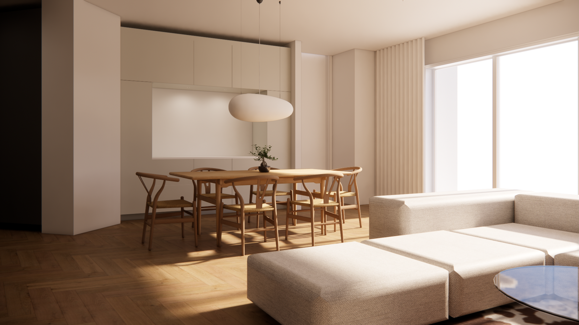 a modern minimalist interior living space with a cozy atmosphere the room features a light beige fabric sectional sofa and a sleek black circular coffee table the dining area has a wooden rectangular table and six matching wooden chairs with curved backs the walls are painted a soft cream color natural light streams in through large white framed windows casting warm reflections on the wooden herringbone patterned floor an elegant oval pendant lamp in matte white hangs above the dining table add a small subtle plant in a simple pot for a touch of greenery