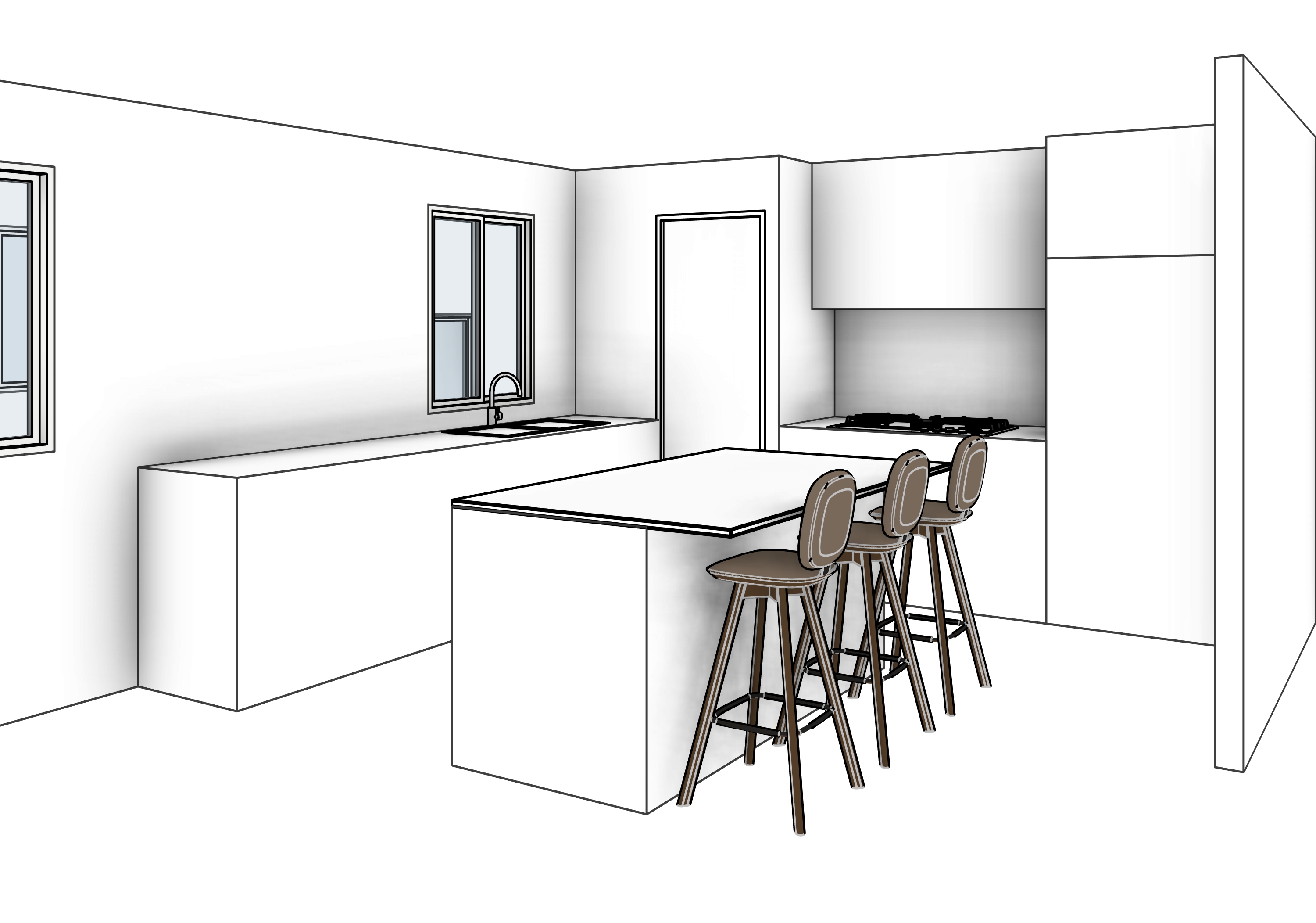 use the provided kitchen image as the unchanged base reference keep the overall layout camera angle and proportions and only enhance materials lighting and realism a calm contemporary kitchen interior with pale timber joinery soft neutral stone benchtops streamlined integrated appliances and simple sculptural pendant lights over a generous island emphasise a warm natural palette clean lines minimal hardware and comfortable upholstered stools to convey a refined yet relaxed residential atmosphere enhance soft daylight gentle shadows subtle reflections and fine material texture for a photoreal high resolution client presentation render that feels inviting airy and sophisticated