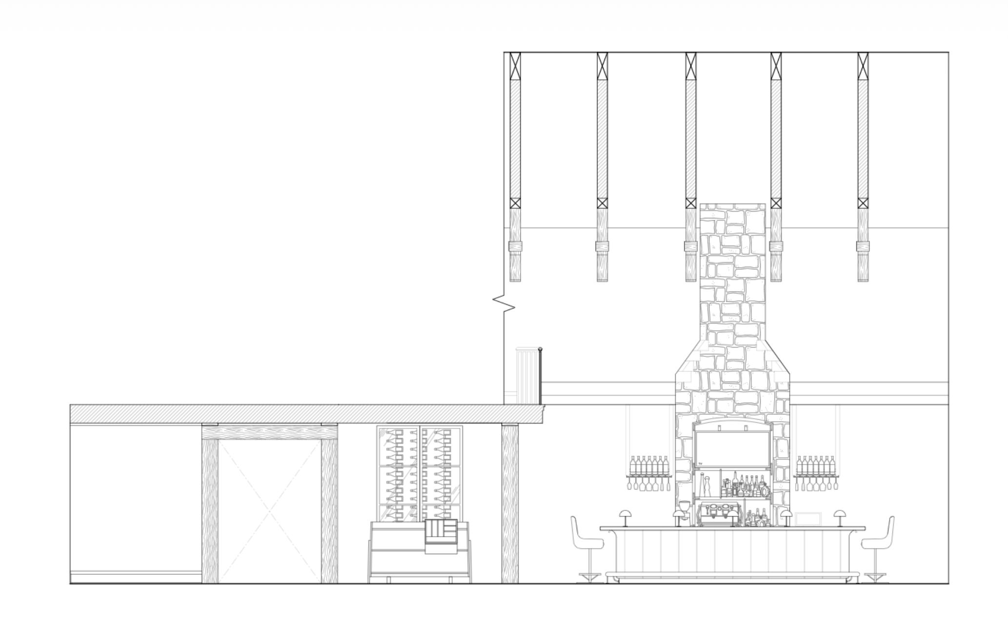 please render this interior elevation of a private golf club it is a renovation of the lolwer level of the attached photo please maintain the stone and truss details but lighten all the walls the bar top and glass rails are to be aged brass with channel quilted leather fronts lights also as image see the image of the materials for colours the stools are attached the cabinet below the wine storage is attached