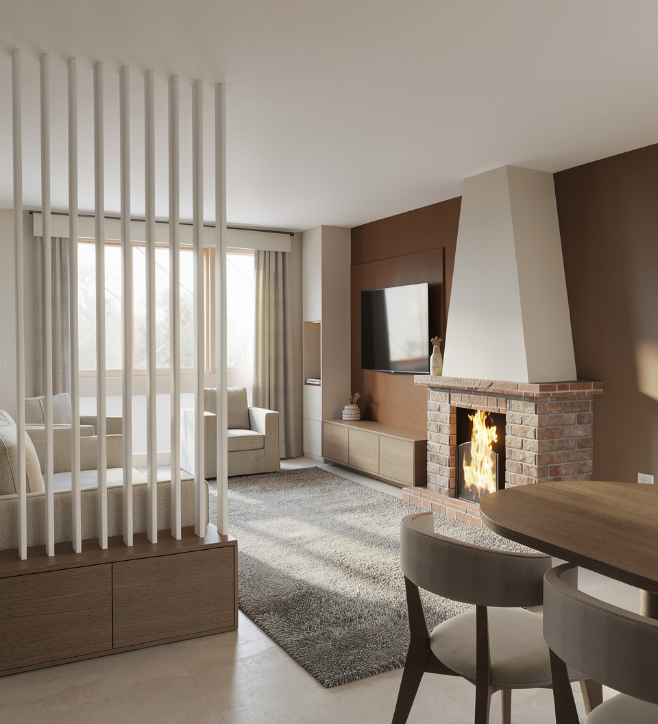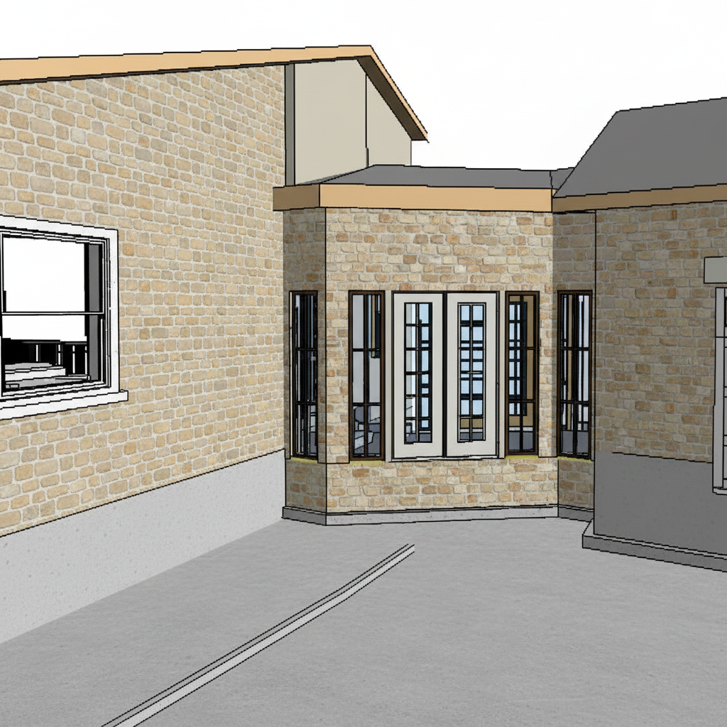 modernist exterior shot the wall material is black burned wood please make it realistic and leave the landscape as it is the ground is dark brown with lush deciduous plants leave the original structure openings are in dark black accurately folloow the geometry architecture