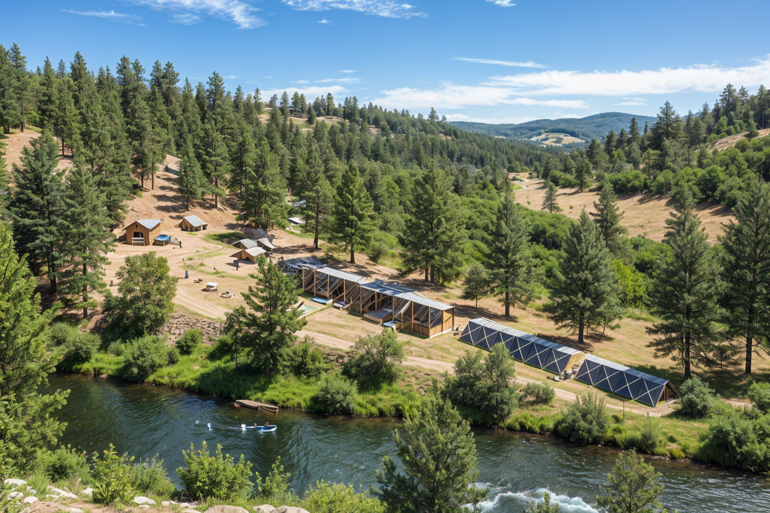 add more trees randomly placed remove all text labels replace x structures with recreational vehicles lined up along the gravel drive recreational vehicles only on the bottom side of the driveway dont change anthing else