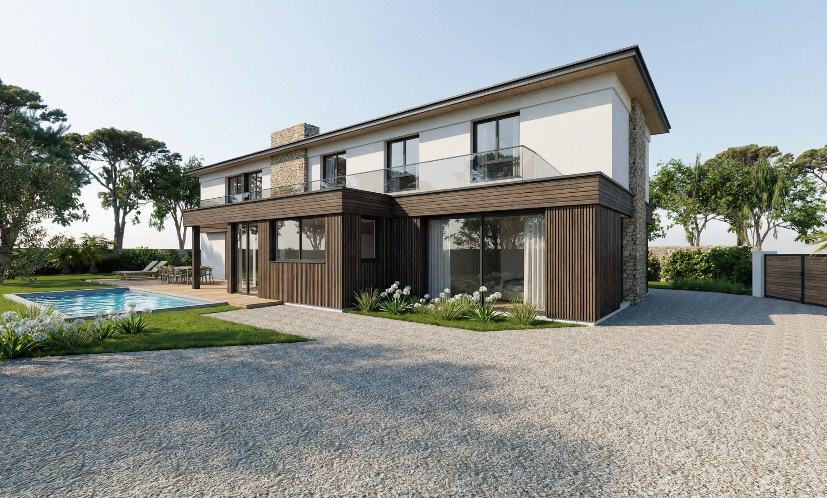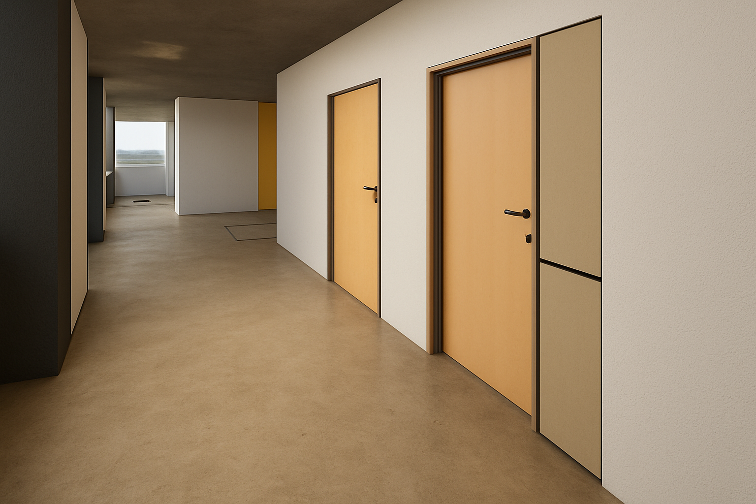 transform this visualization to a refined daytime lighting scenario maintain all materials finishes geometry and furniture exactly as designed introduce soft natural daylight entering from the windows with diffused shadows and gentle highlights on mineral surfaces emphasize the light stone plaster and champagne textiles the atmosphere should feel calm luminous and breathable with subtle reflections on walnut wood and very soft contrast no change in materials or layout focus on natural light layering and spatial clarity