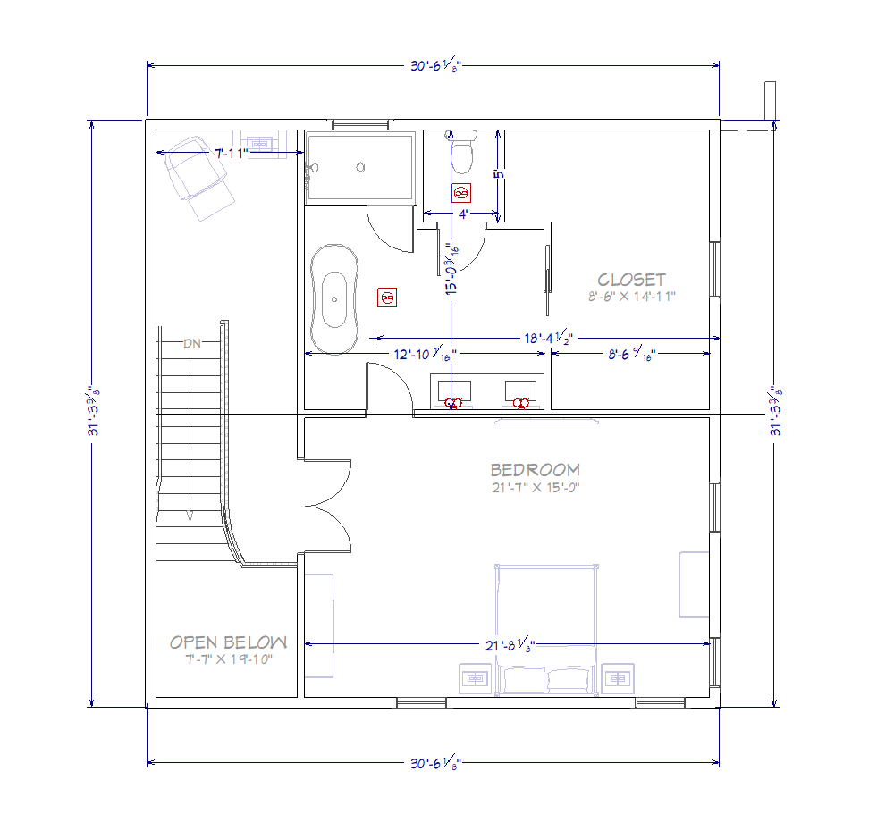 convert this floor plan into a realistic isometric 3d view of a full house show the space from an elevated angle with furniture walls and details visible a beautifully rendered room layout with a tranquil and elegant atmosphere the walls are a soft cream color and the floor is a warm oak wood the bathroom features a large white bathtub and a modern sink with silver fixtures accentuated by light gray tiles the closet has sleek white sliding doors the bedroom boasts a king sized bed with a plush light blue duvet and matching pillows the area is softly lit with warm ambient lighting creating a cozy and inviting atmosphere the staircase is elegantly crafted from dark mahogany natural sunlight filters through large sheer white curtains casting a gentle glow across the room use the same furniture as shows on the plan do not change the orientation of the floorplan