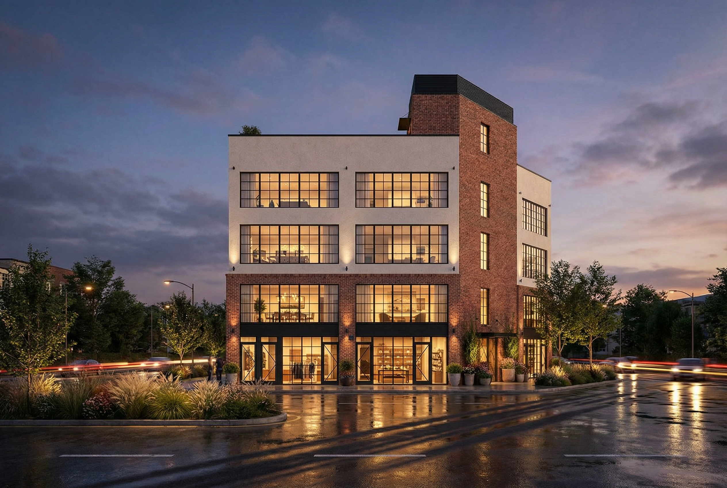 exterior shot make this elevation into a photo realistic rendering that is the elevation given make it have the same brick roof and windows as the front architecture architecture